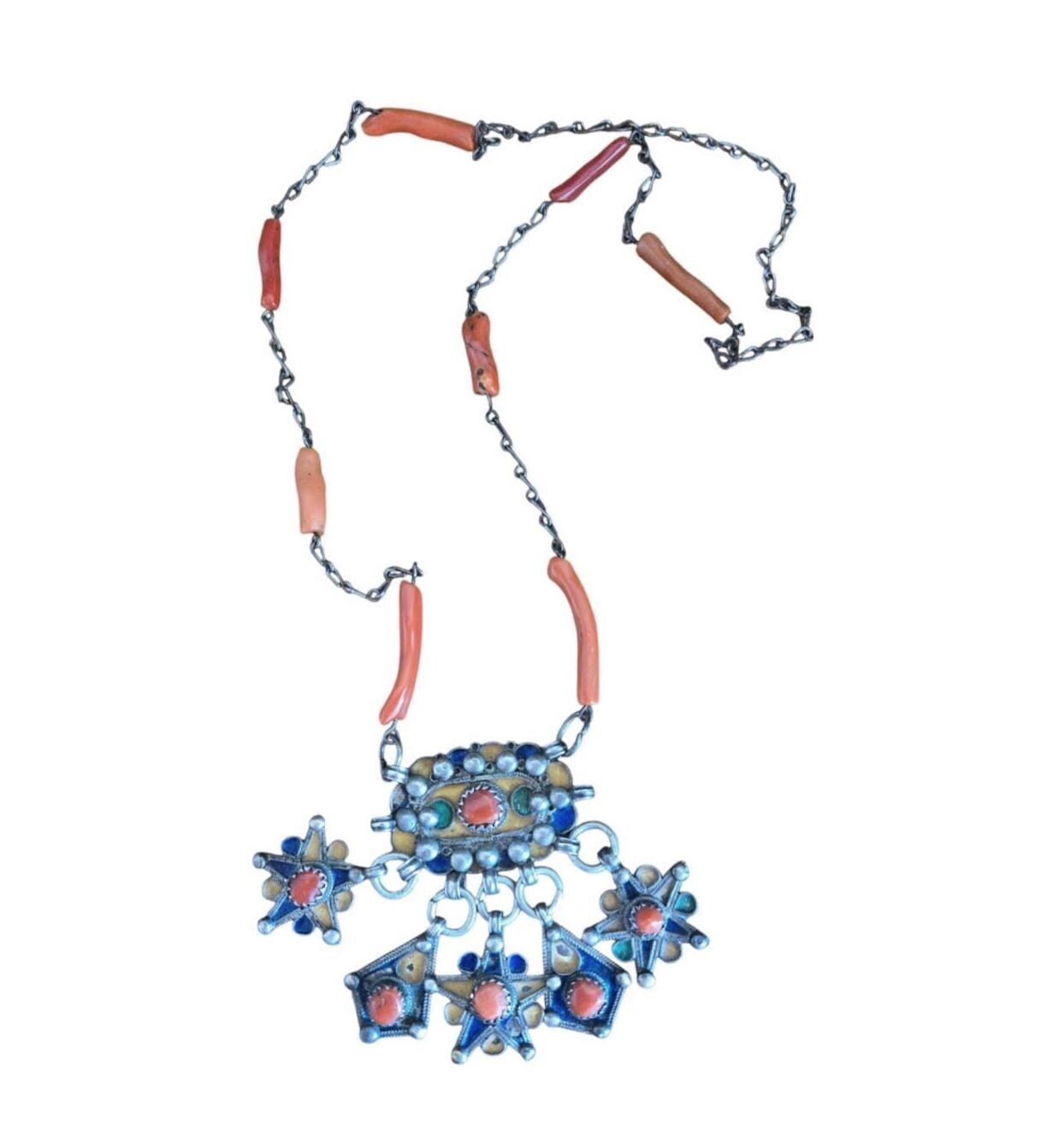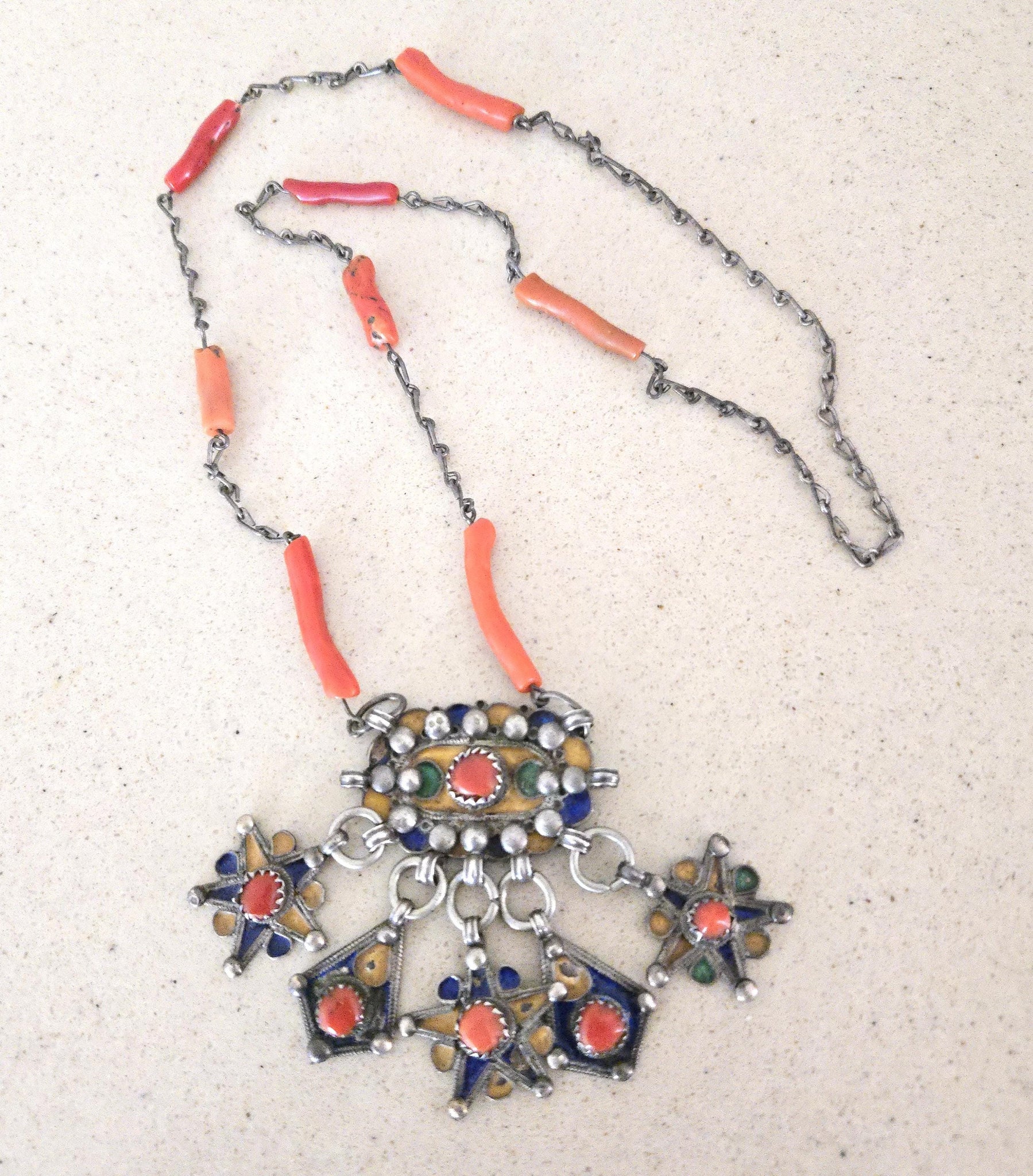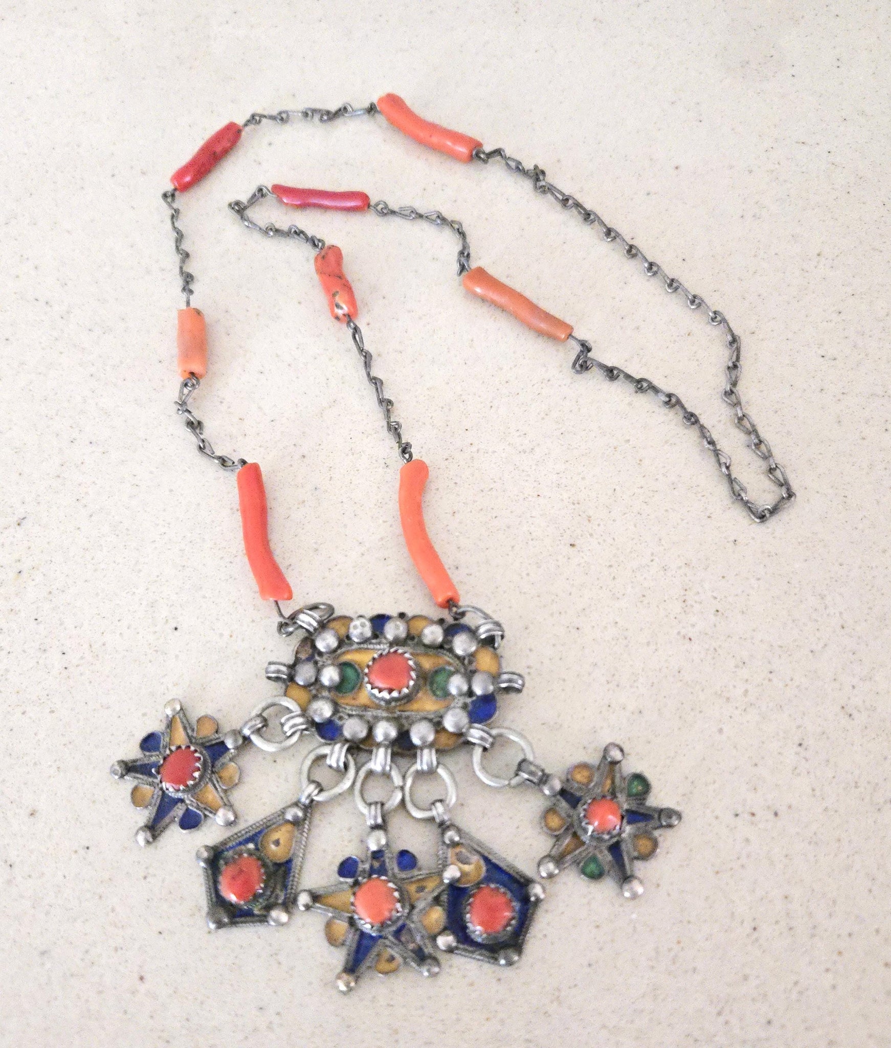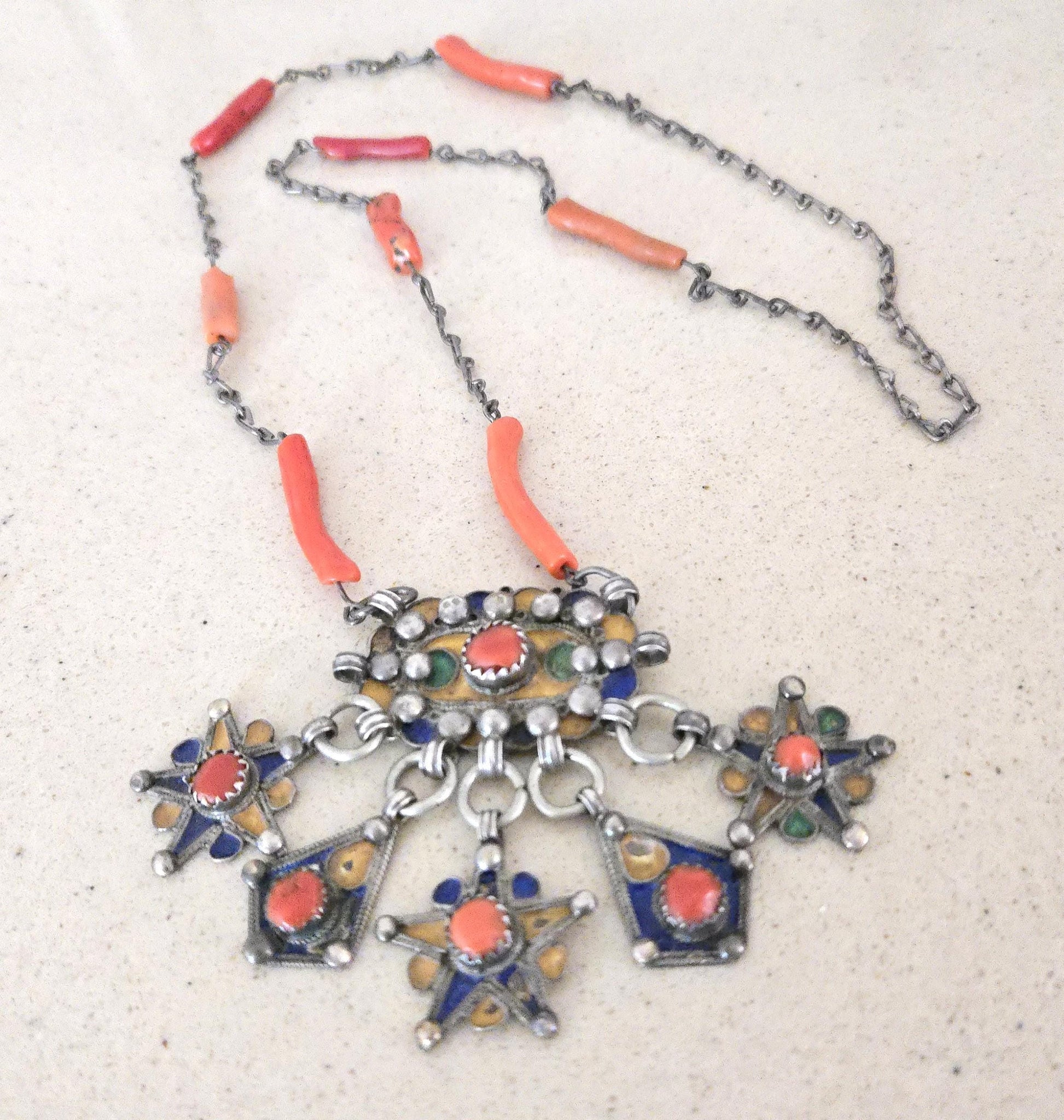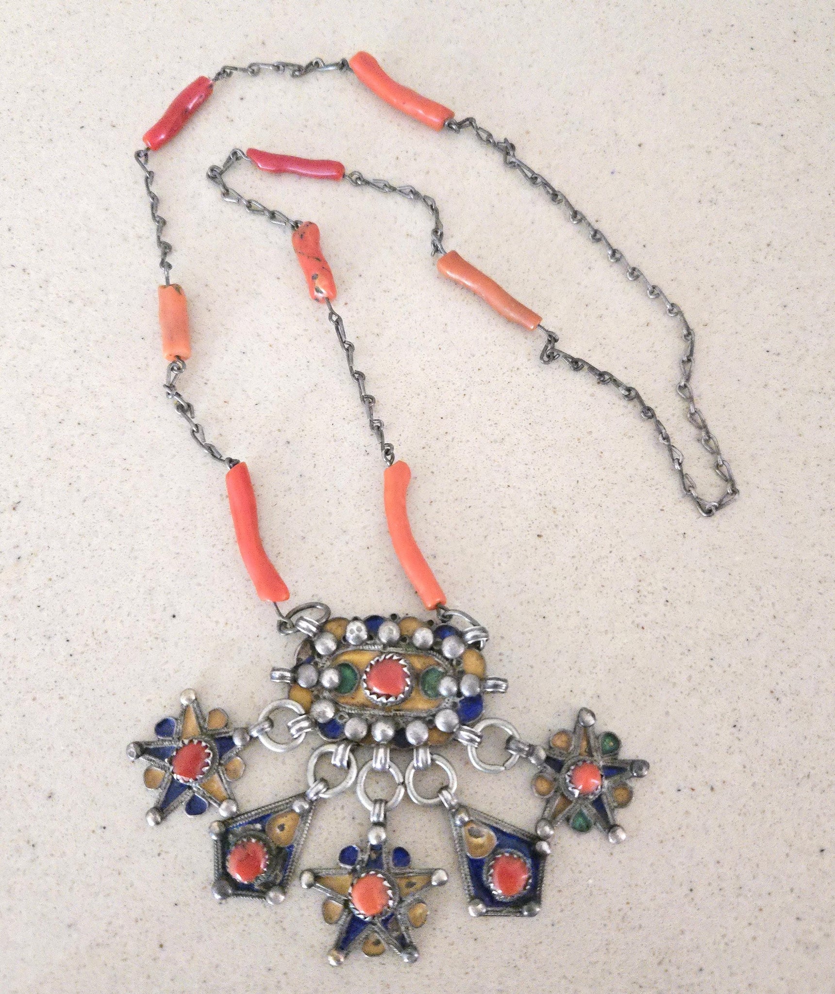 Antique Kabyle Coral Bead Necklace: Algerian Silver Pendants, Ethnic Jewelry