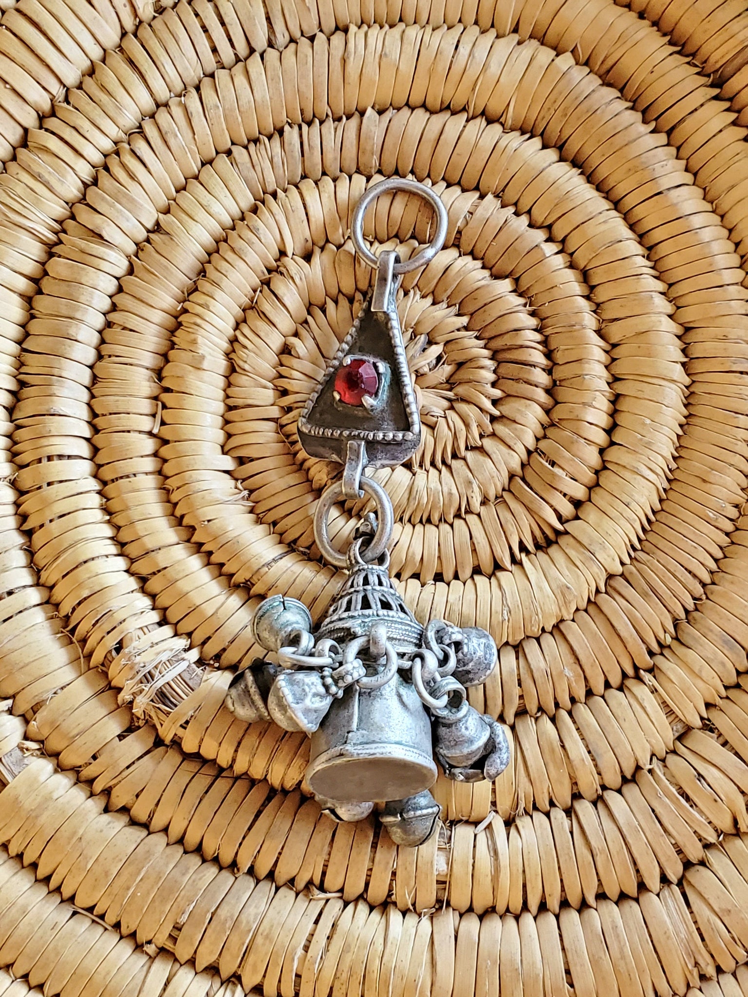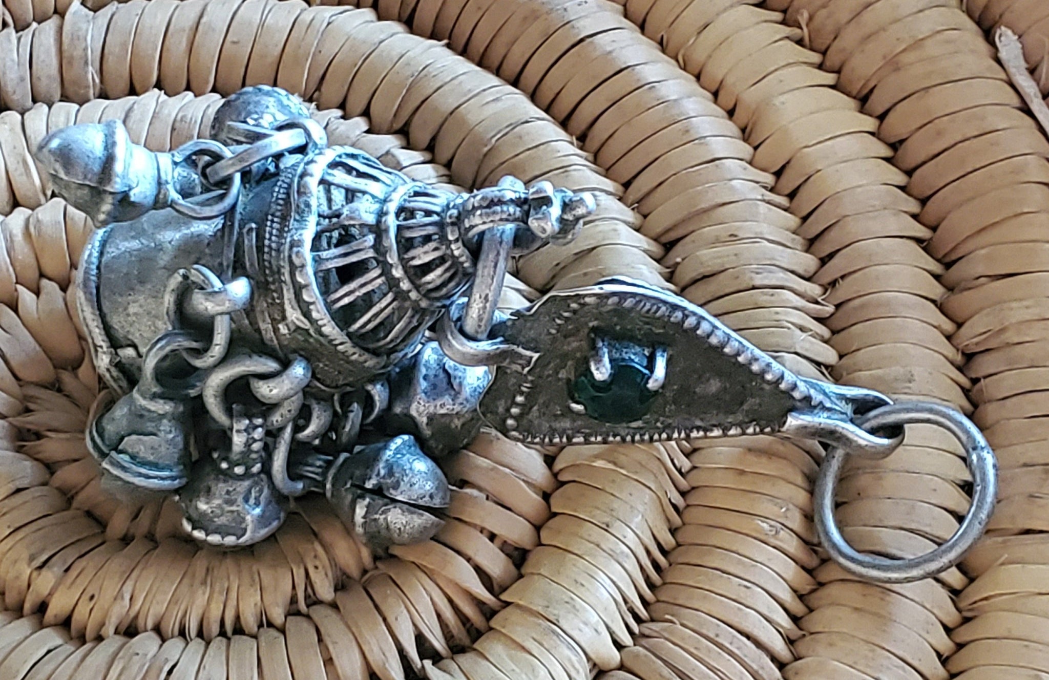 antique Moroccan silver chased box pendant with silver dangles and red in green glass cabochon beads.