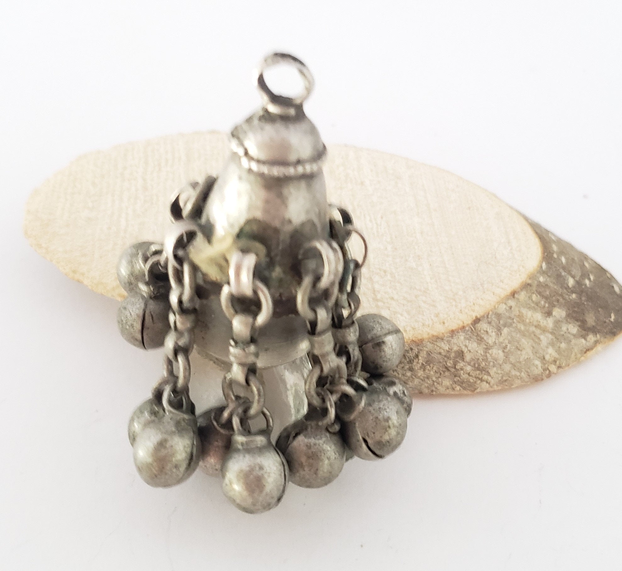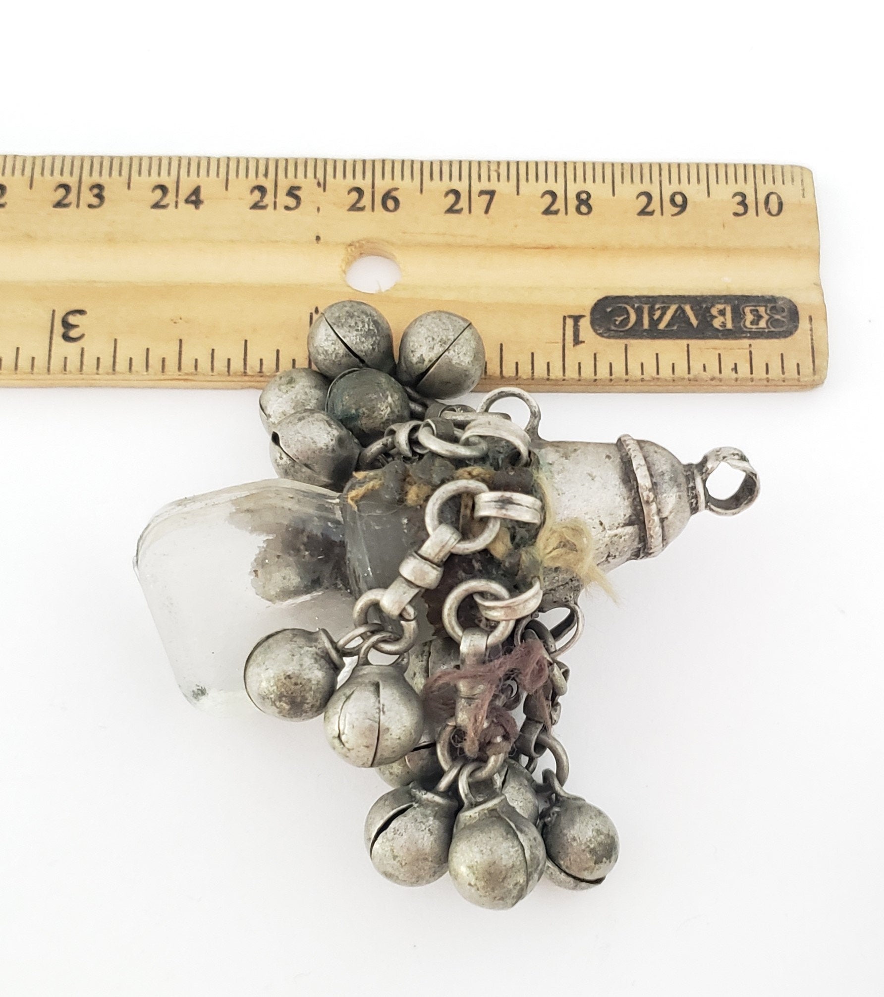 antique Moroccan very Rere silver glass talisman with dangle silver pendant with dangle silver beads from Middle Atlas ( from South-West to North-East ), in Morocco. These boxes were hanged up to fibulae and . Early to mid 20th century. The box is made up with sterling silver 925 dangles pendants In good conditions. A rare ideal for necklace project.It measure about ( 2 " ) in diameter and the height ( 3" ) The thickness is ( 1" ). Weighs 20 grams features fantastic wire-work; please refer to the photos It is in good condition commensurate with age and use.The box portion is empty and somewhat dented on the back (see photo)Early 20th century other shop https://www.etsy.com/shop/Africanbazar2US?ref=seller-platform-mcnav