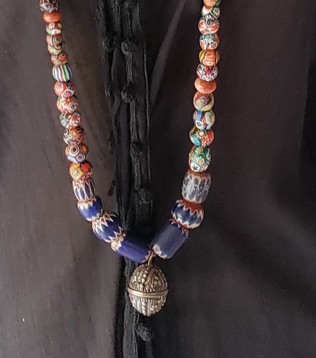 Beautiful Strand Large Silver Bead form 20th century, Rare and Antique 7 Large Chevron Venetian Trade Beads Seven Layer Venetian and Multiple Cane Millefiori Oval beads and Venetian Millefiori Round Beads W/ Multiple Cane Inserts and other Trade beads chevron and Kiffa Beads Agate Beads These beads are beautiful. The coloration is unique. These beads are rare, Hard to come by It was used in the African trade in the late 1800‘s These are called Millefiori chevron Kiffa Agate Beads wear in Africa. Made in Venice, traded in Africa. 1800‘s. beads are in very good condition.These Old glass beads from Africa. These beads are quite irregular. Please expect some imperfections in size and shape.A beautiful strand to add interest and texture to any jewellery.Each bead is unique, color, pattern of dots, and size. Approximate Product Specifications: Name: Large Silver Bead Millefiori beads chevron beads Kiffa beads Agate beads Strand:43‘‘ Material: Glass Origin: Venice Italy. African Traded