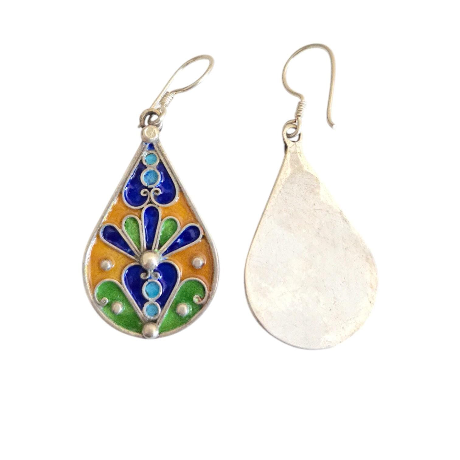 Moroccan Berber Dangle Earrings with enamels Sterling Silver This is a great authentic jewelry from Morocco. Each earring measures just over 2" long and just under 1‘‘ wide./ 28.gr The workmanship is wonderful. These earrings were handmade sterling silver 925 new high-silver content if you have any questions - Feel free to contact me. . Thank you for visiting my shop All my jewelry has been collected over 20 years ago .I will be listing more pieces shortly as I am constantly always working on posting more. piece to add to the collection .I ship all over the world and price includes a tracking service.