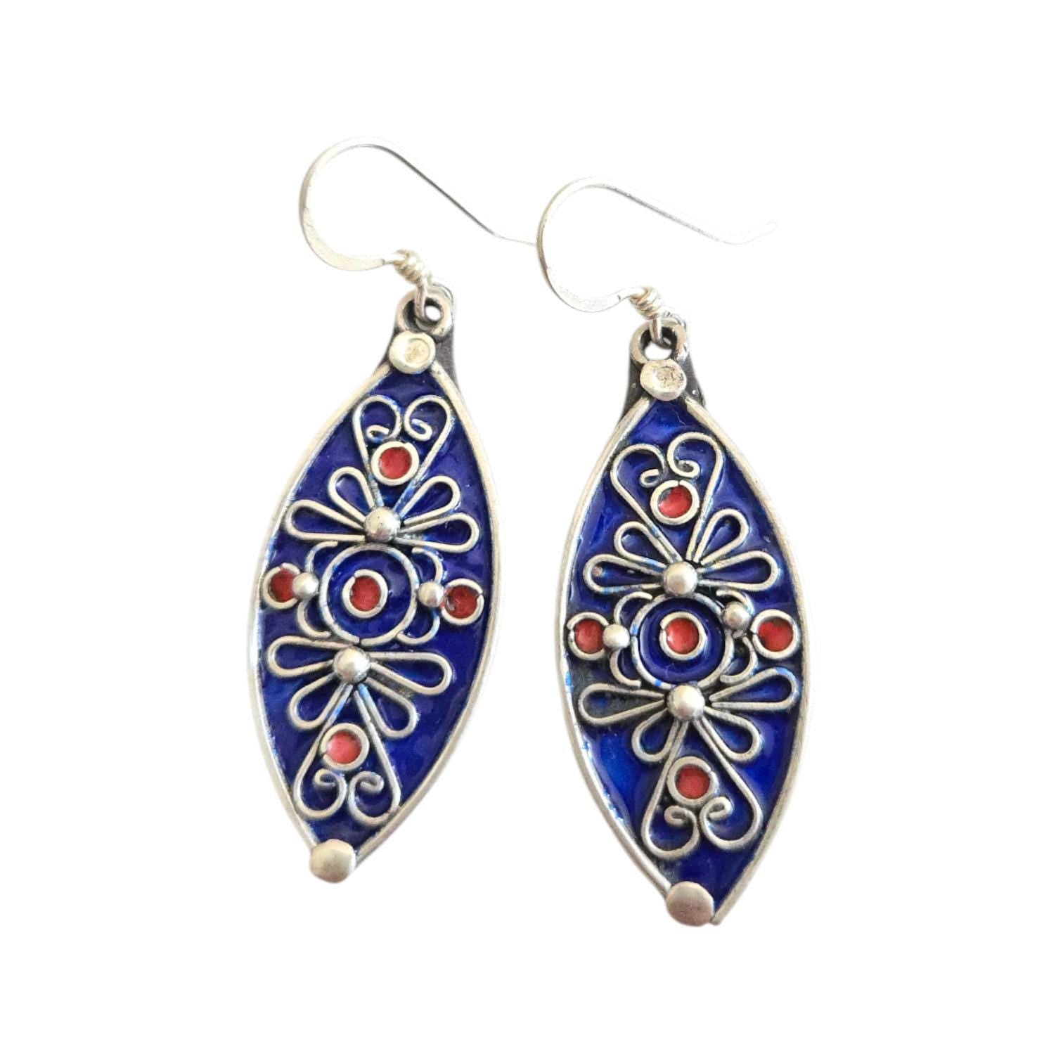 Moroccan Berber Dangle Earrings with enamels Sterling Silver This is a great authentic jewelry from Morocco. Each earring measures just over 2".5 long and just under 1‘‘ wide./ 22.gr The workmanship is wonderful. These earrings were handmade sterling silver 925 new high-silver content if you have any questions - Feel free to contact me. . Thank you for visiting my shop All my jewelry has been collected over 20 years ago .I will be listing more pieces shortly as I am constantly always working on posting more. piece to add to the collection .I ship all over the world and price includes a tracking service.