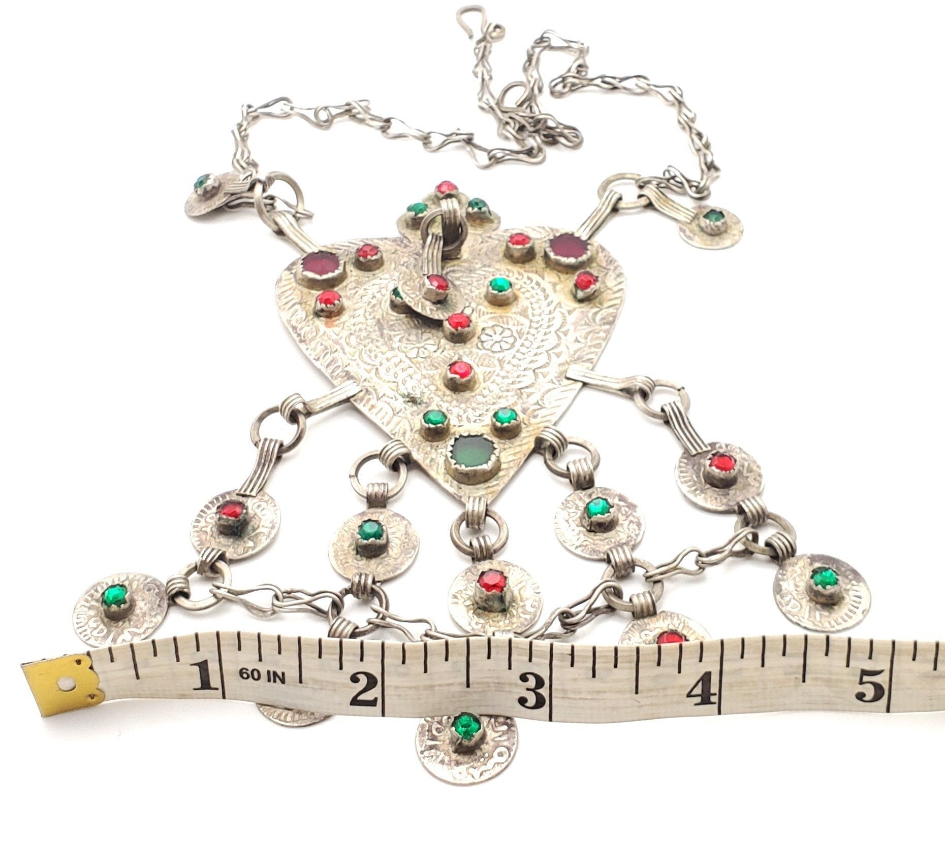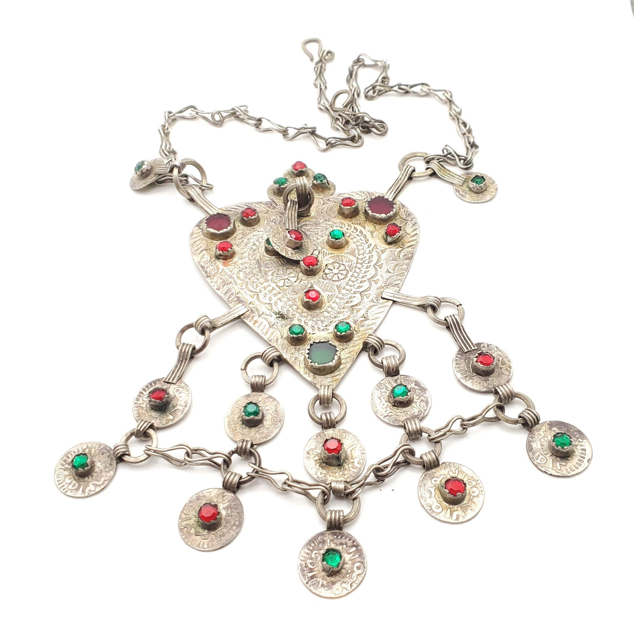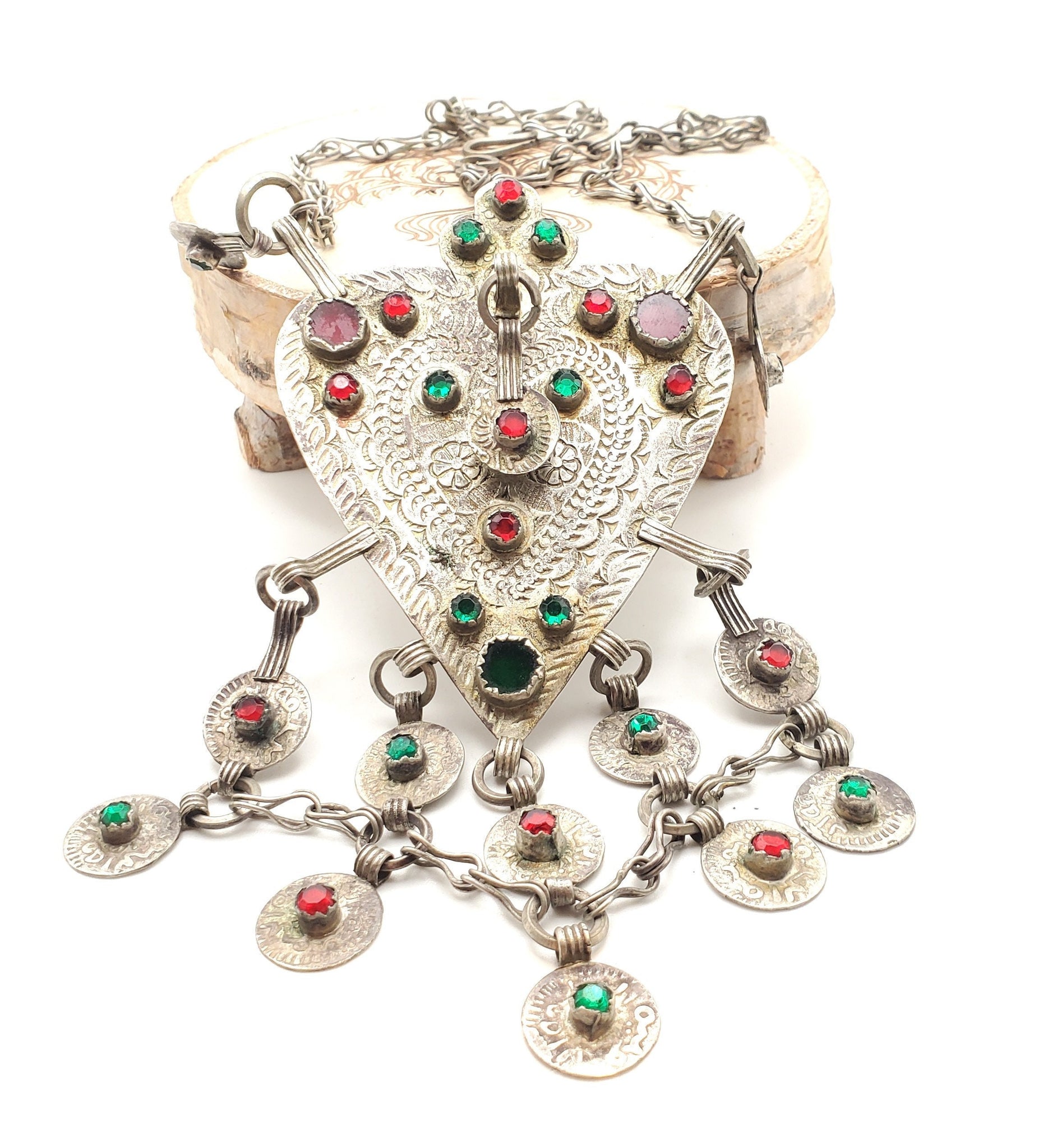 handmade silver Moroccan Berber silver Coin Pendant Necklace 1960s the silver looks much better than in the picc abut 5" x 5‘‘ long x 22"sterling silver 925 The Native people of North Africa are called Imazighen (Amazigh for singular), where we can find different dialects such as Kabyle, Tuareg, Chawi, Shelhi, Amazigh, Rifa, Mouza bit, etc. The Tuaregs refers then to the Amazigh/Berber people of the Sahara Desert Algeria, they are specialized in a lot of handcrafted artifacts such as leather products, Berber Rugs, and Silver Tuareg Jewlery with natural stones for hundreds of years. They excel in it all in keeping its traditional aspect, they are never mass produced, and they are never identical as they have always been handmade one by one. This piece it‘s in its original settings other shop......africanbazaarus.com