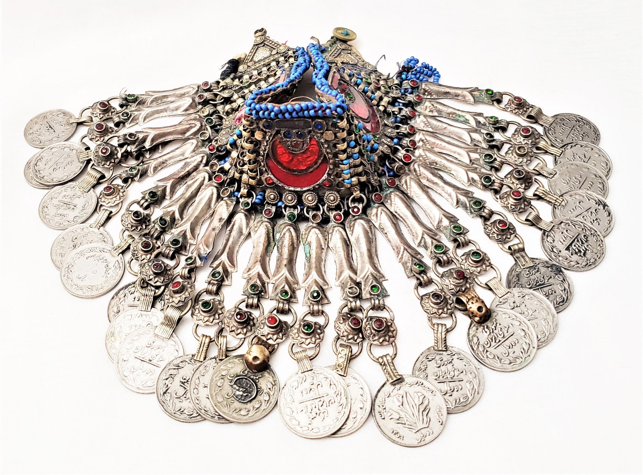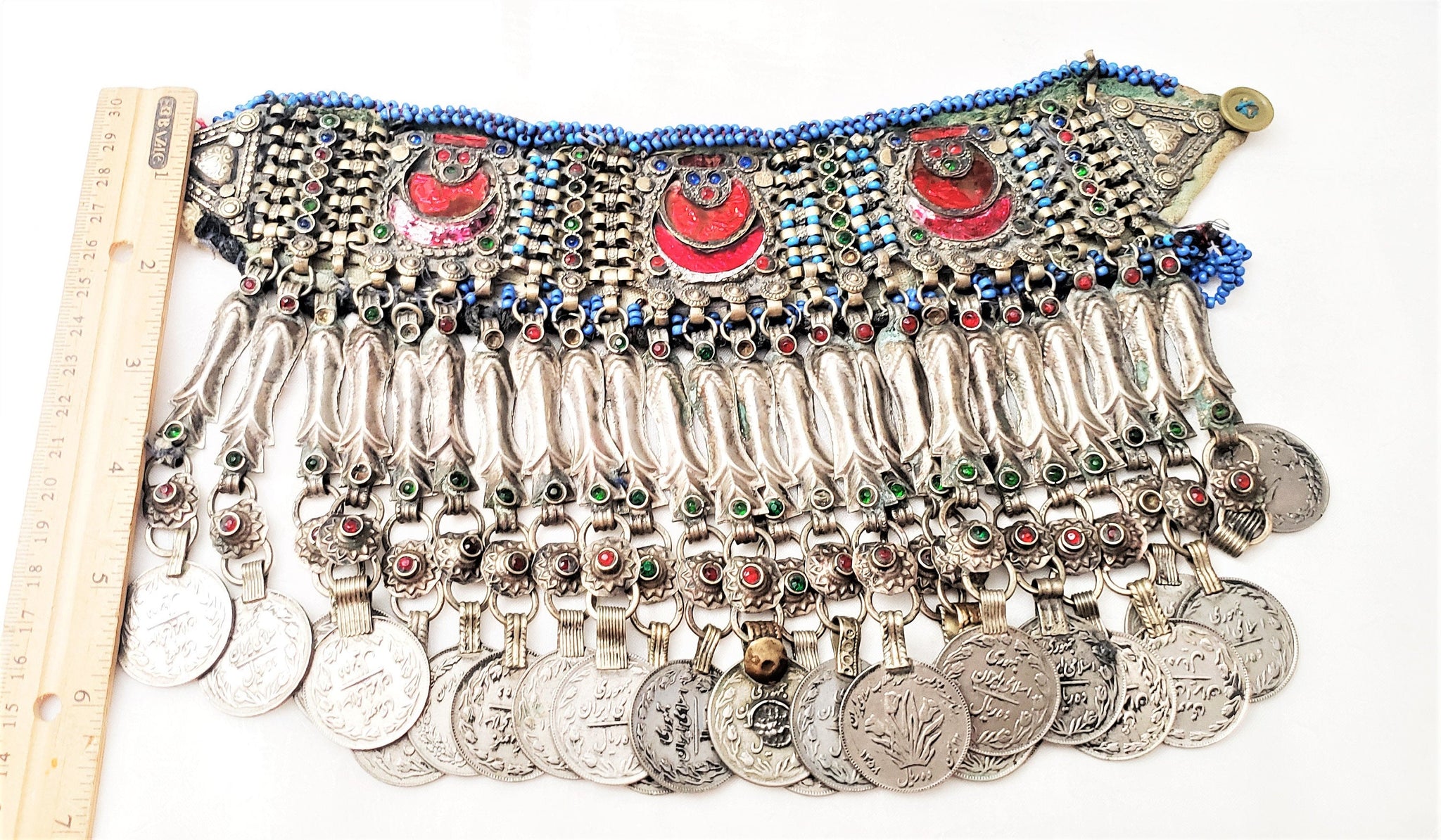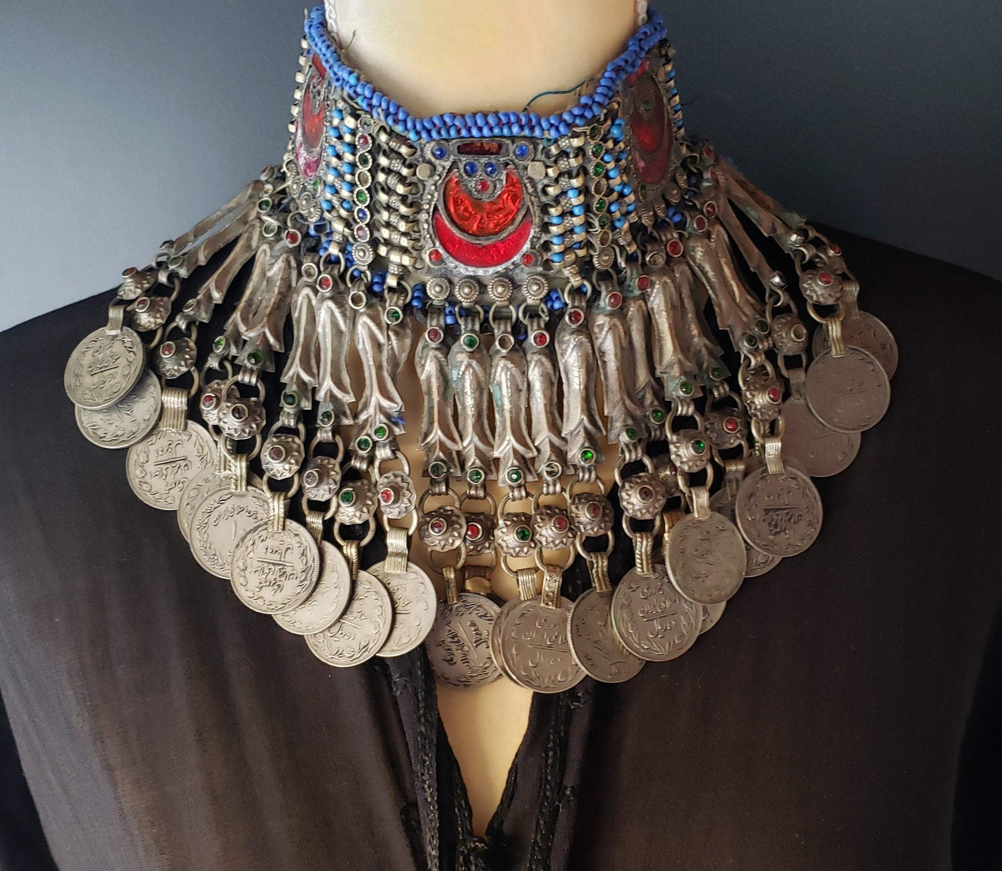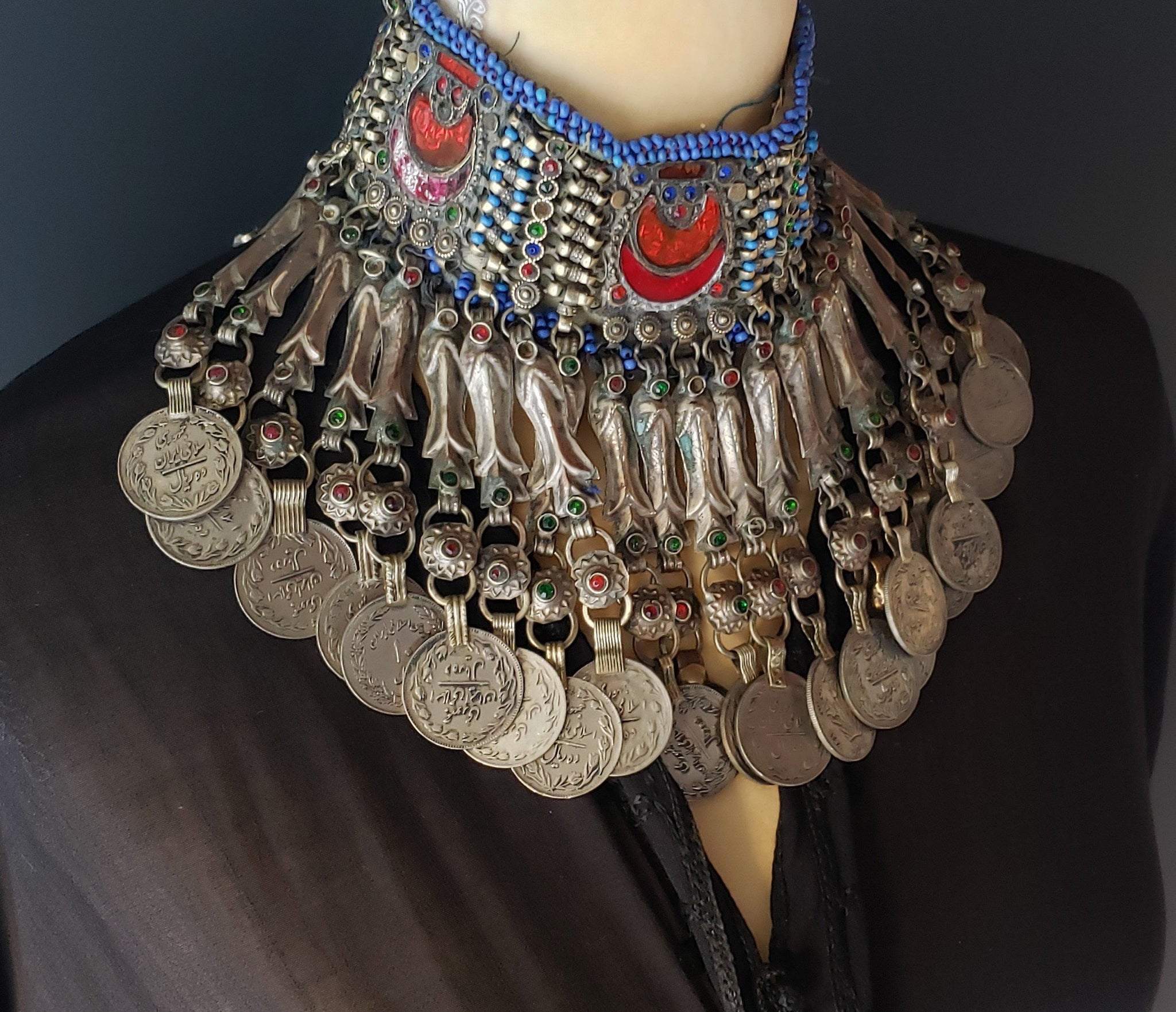 There's some colorful glass insets and coind hanging from the choker.