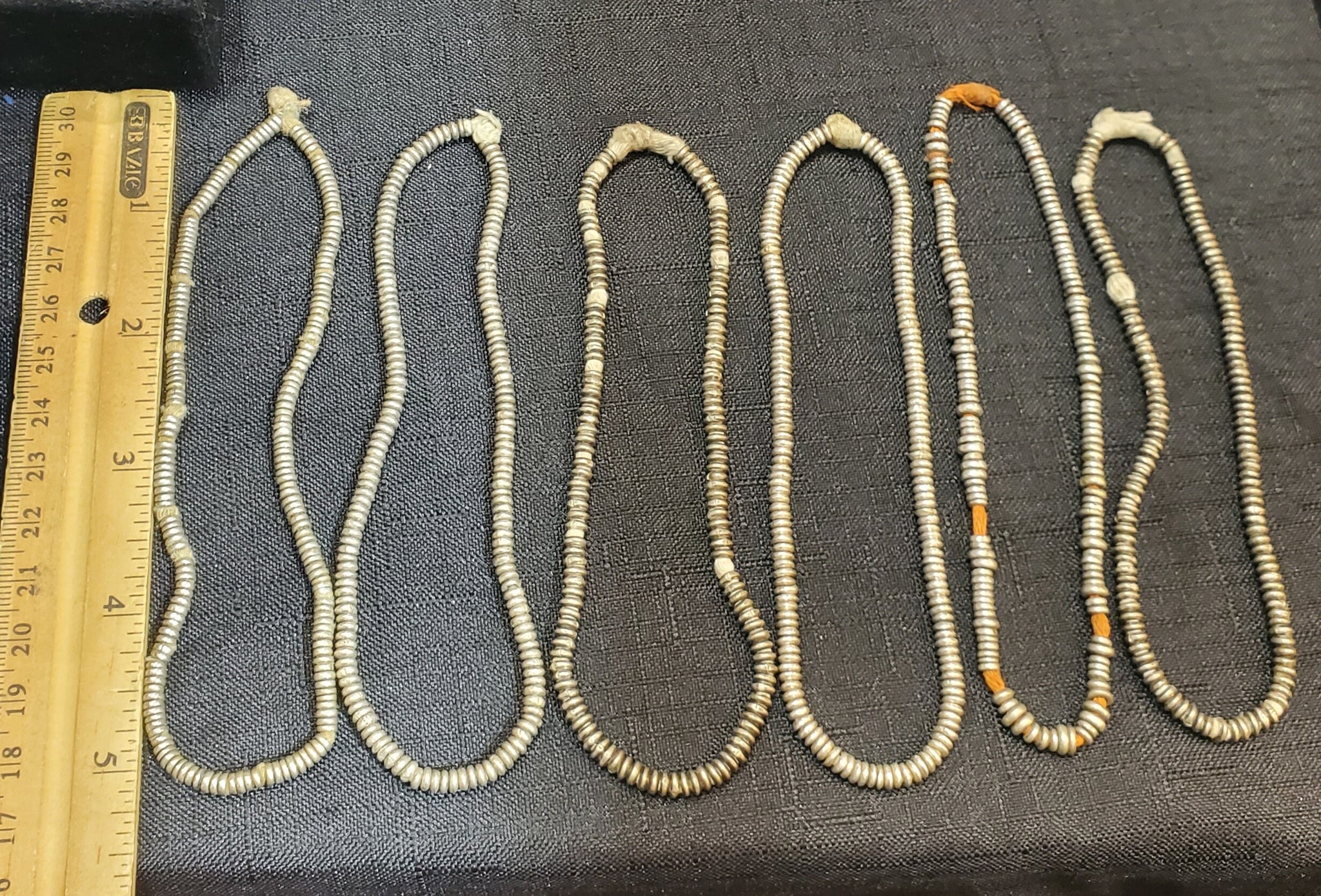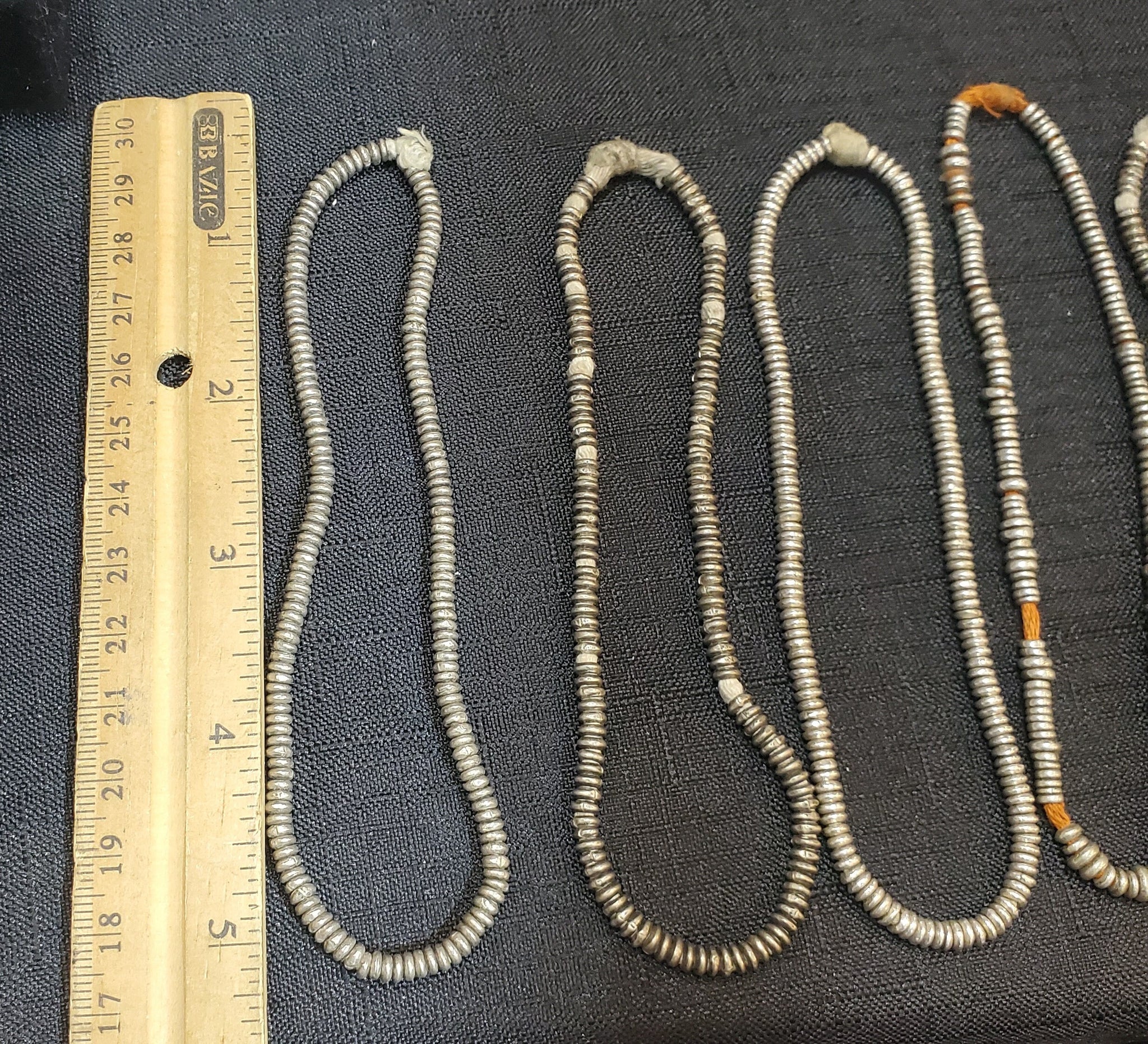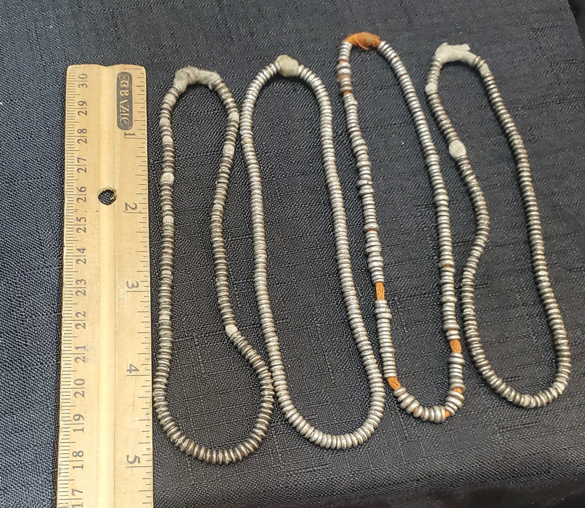 4 very old strand of silver Heishi Anklet beads beautiful! May have once been an anklet! from-Ethiopia These beautiful very old silver Heishi Anklet beads strand form Ethiopian on raffia 10 inches strand Silver bead measures of small 3mm diameter x 2mm thick heishi from Ethiopia; high silver content. Over 100 years old; and The hole is 2mm wide.... A beautiful strand to add interest and texture to any jewellery The beads are in very good condition.very collectible and would be perfect for adding to your Ethiopian collection.