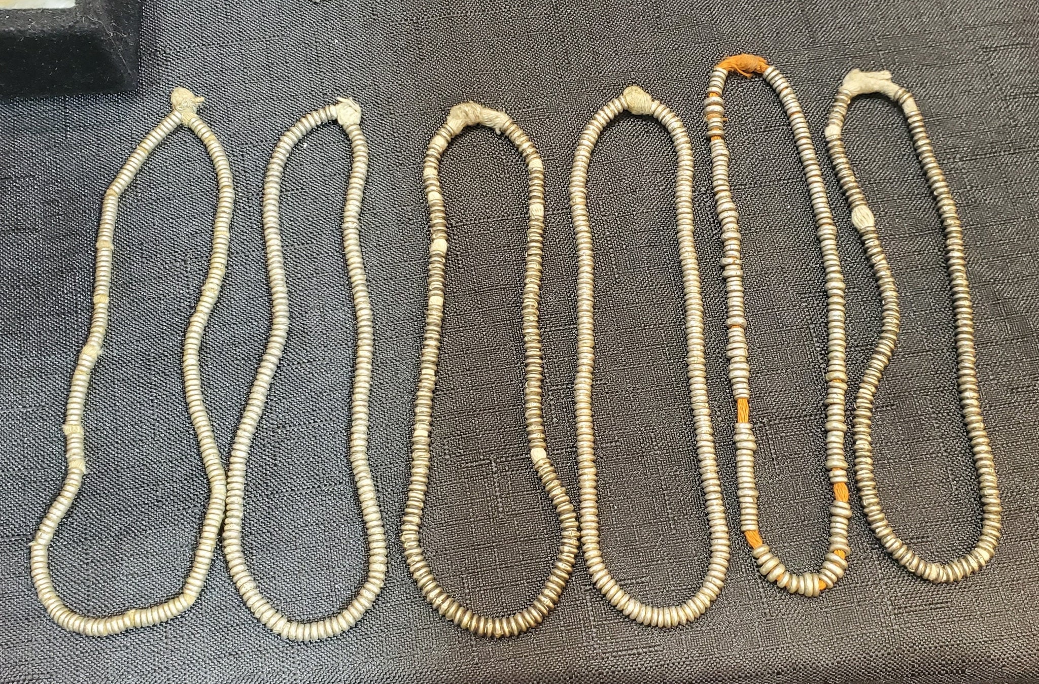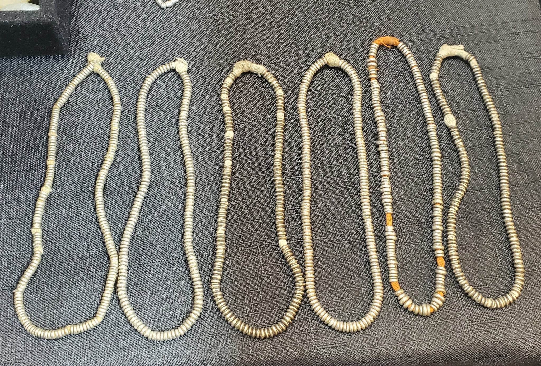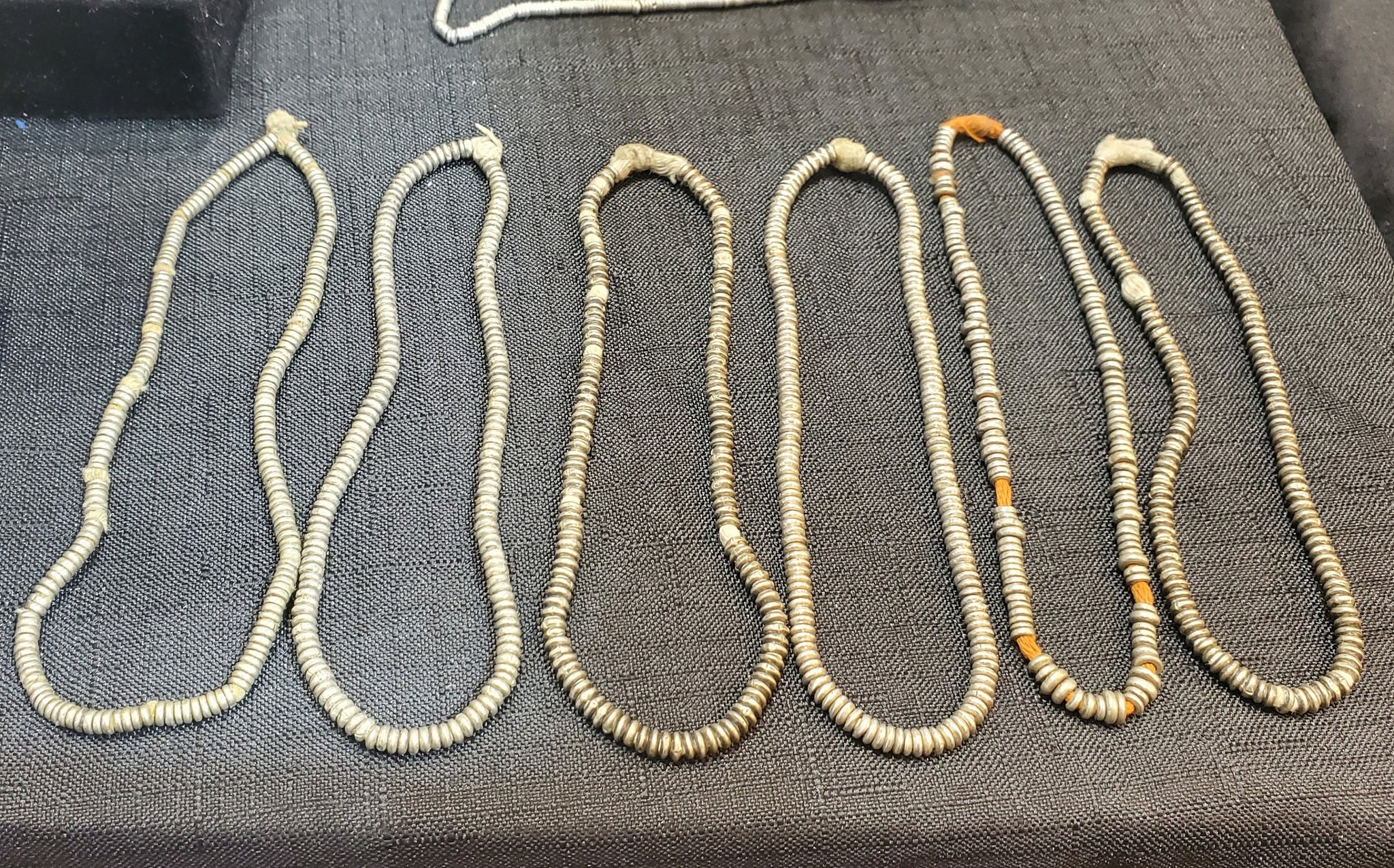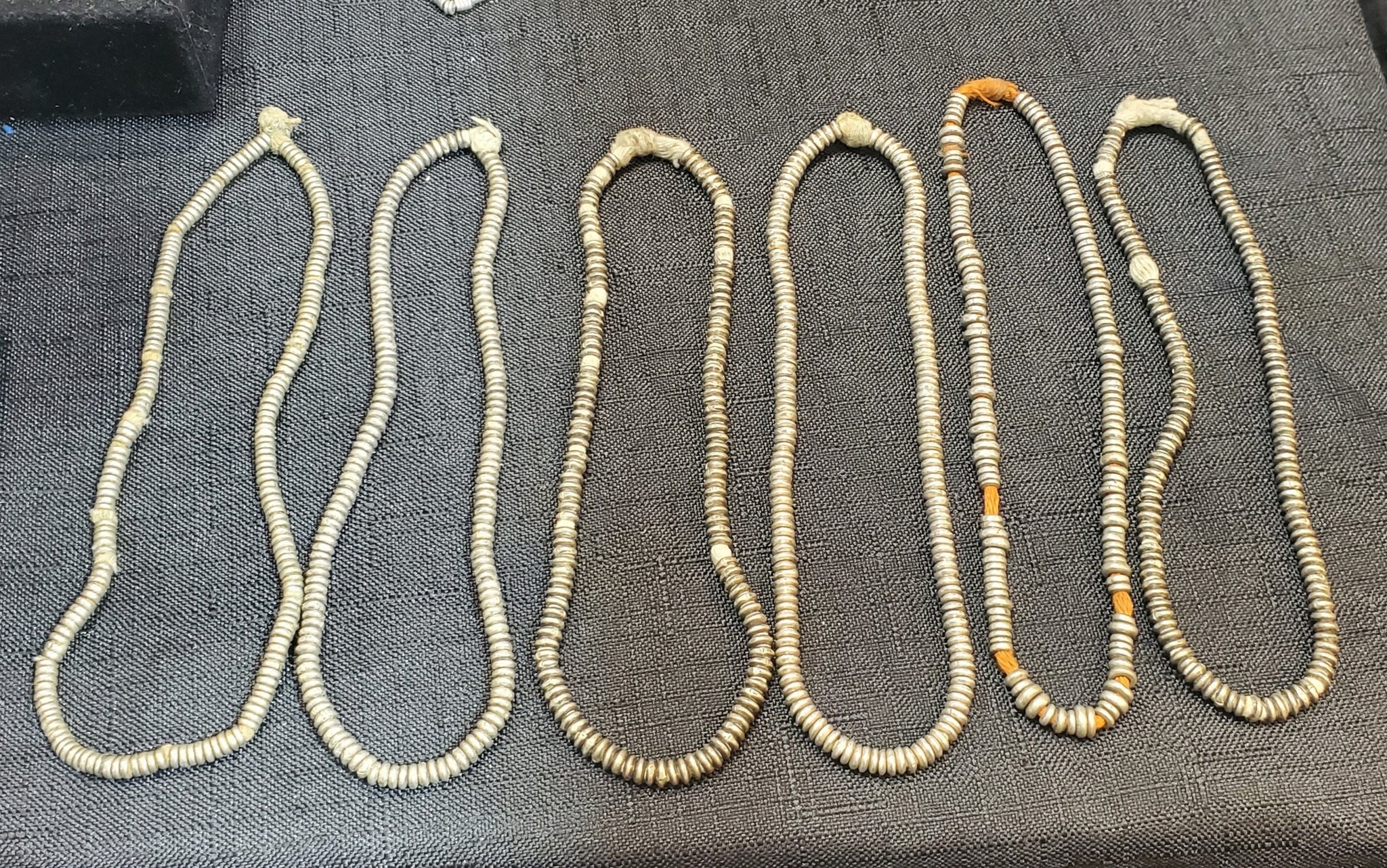 4 very old strand of silver Heishi Anklet beads beautiful! May have once been an anklet! from-Ethiopia These beautiful very old silver Heishi Anklet beads strand form Ethiopian on raffia 10 inches strand Silver bead measures of small 3mm diameter x 2mm thick heishi from Ethiopia; high silver content. Over 100 years old; and The hole is 2mm wide.... A beautiful strand to add interest and texture to any jewellery The beads are in very good condition.very collectible and would be perfect for adding to your Ethiopian collection.