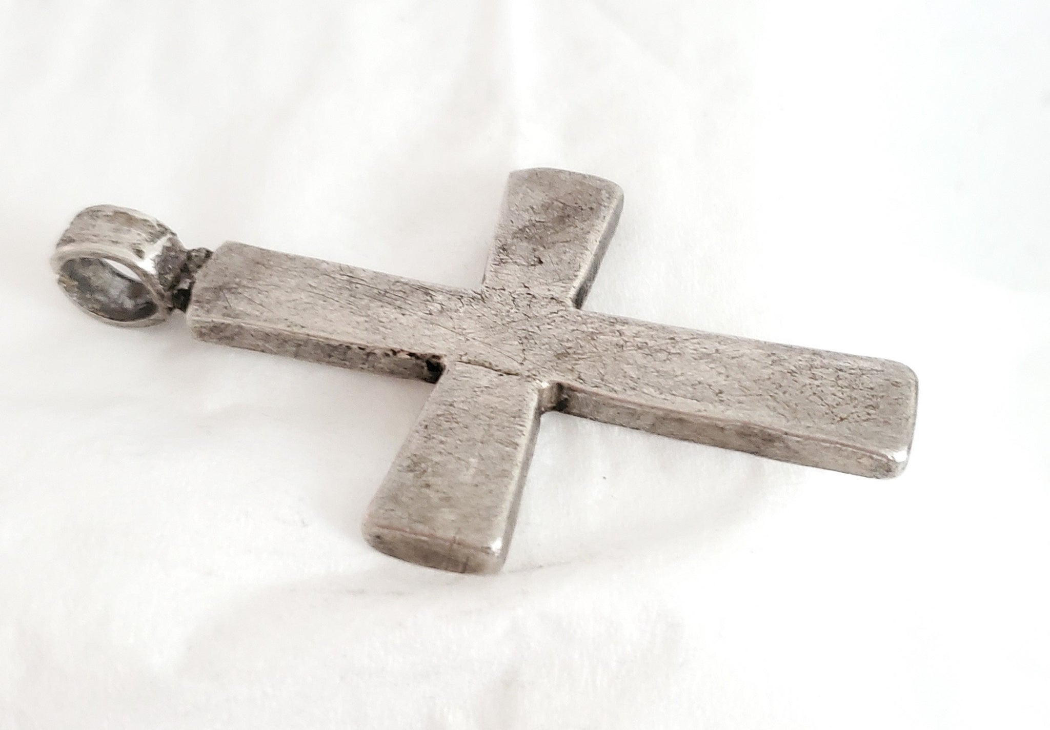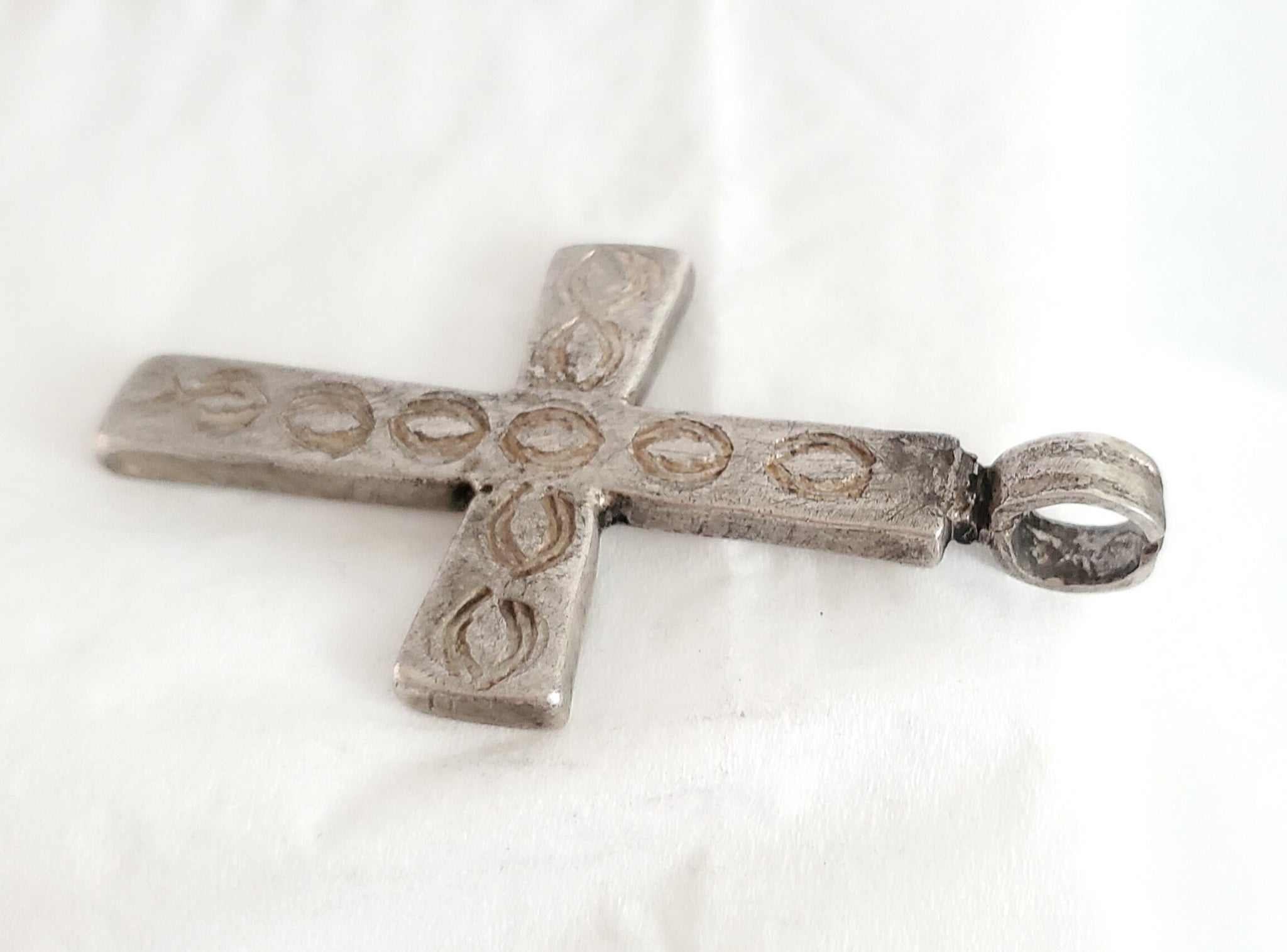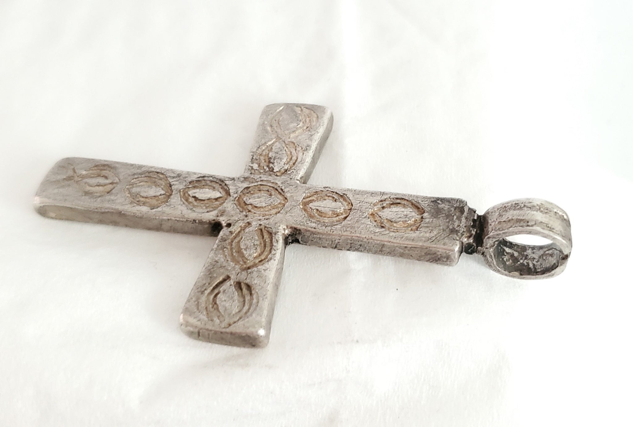 beautiful old handmade Ethiopian cross pendant made of silver . In Ethiopia particularly among Orthodox Church followers, to wear a cross implied to be protected by the lord himself as well as to show that they are a devoted Christian. Neck or pictorial crosses are tied round their owner’s neck with a piece of blue thread or cord, which was sometimes given to the wearer at baptism. This particular cross pendant is old and has been used. Measures approximatelty 2" x 1‘‘.5 long Age: over 100 great condition Collectible other shop .....africanbazaarus.com