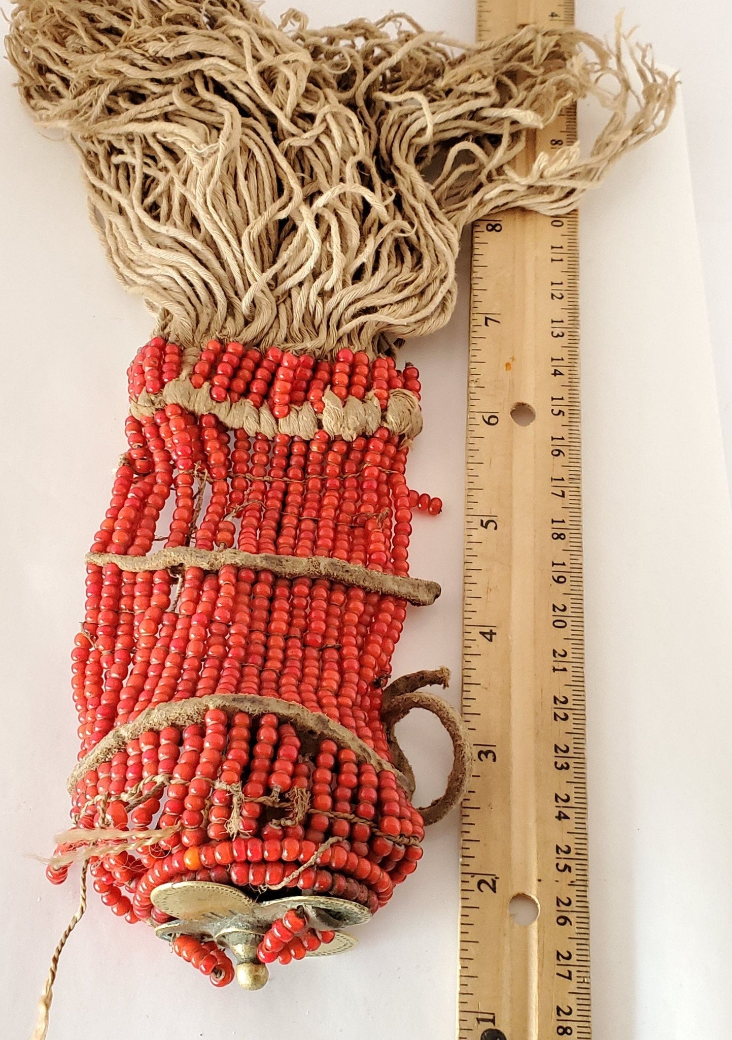 Old Hand Crafted Antique Ethiopian tribal piece red white heart beads brass pendant adornment red white heart beads Old hind made by Ethiopian tribe using antique white heart beads, from