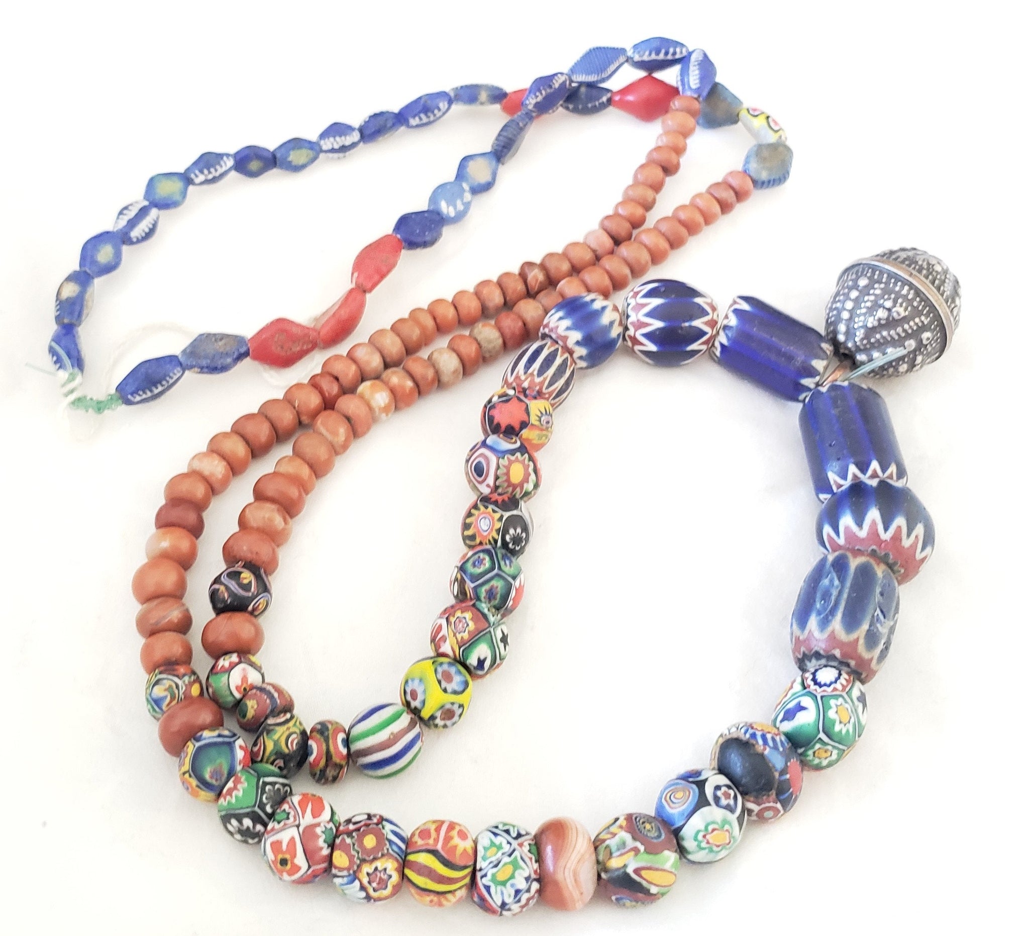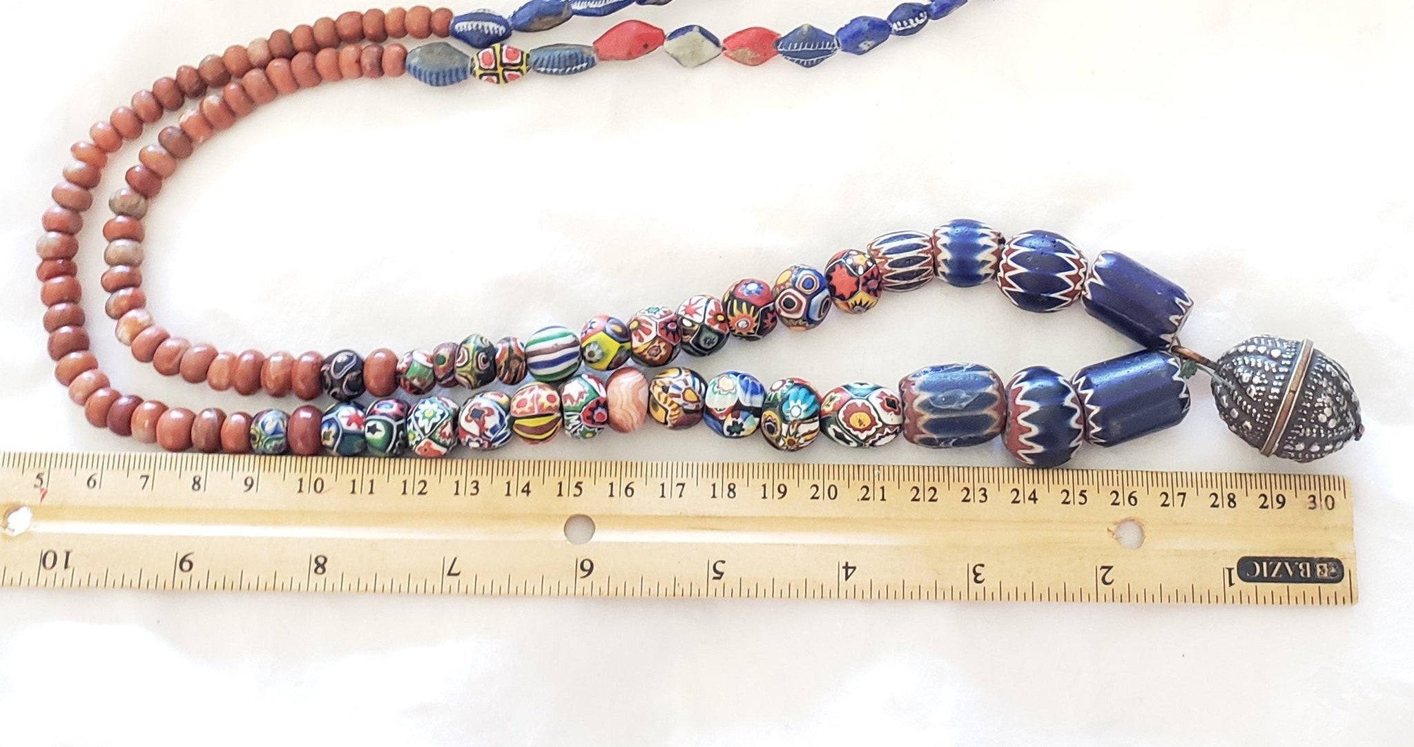 Beautiful Strand Large Silver Bead form 20th century, Rare and Antique 7 Large Chevron Venetian Trade Beads Seven Layer Venetian and Multiple Cane Millefiori Oval beads and Venetian Millefiori Round Beads W/ Multiple Cane Inserts and other Trade beads chevron and Kiffa Beads Agate Beads These beads are beautiful. The coloration is unique. These beads are rare, Hard to come by It was used in the African trade in the late 1800's These are called Millefiori chevron Kiffa Agate Beads wear in Africa. Made in Venice, traded in Africa. 1800's. beads are in very good condition.These Old glass beads from Africa. These beads are quite irregular. Please expect some imperfections in size and shape.A beautiful strand to add interest and texture to any jewellery.Each bead is unique, color, pattern of dots, and size. Approximate Product Specifications: Name: Large Silver Bead Millefiori beads chevron beads Kiffa beads Agate beads Strand:43'' Material: Glass Origin: Venice Italy. African Traded