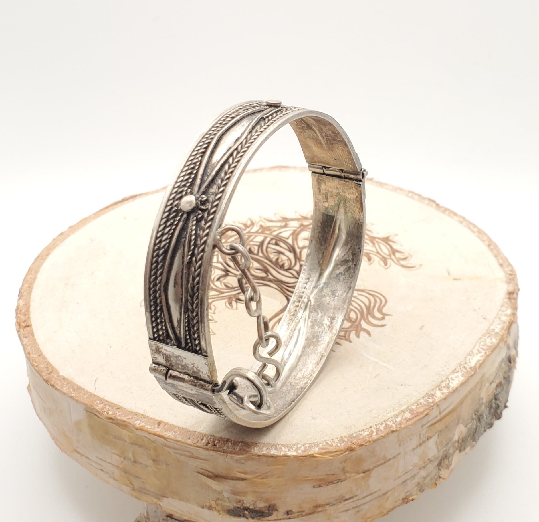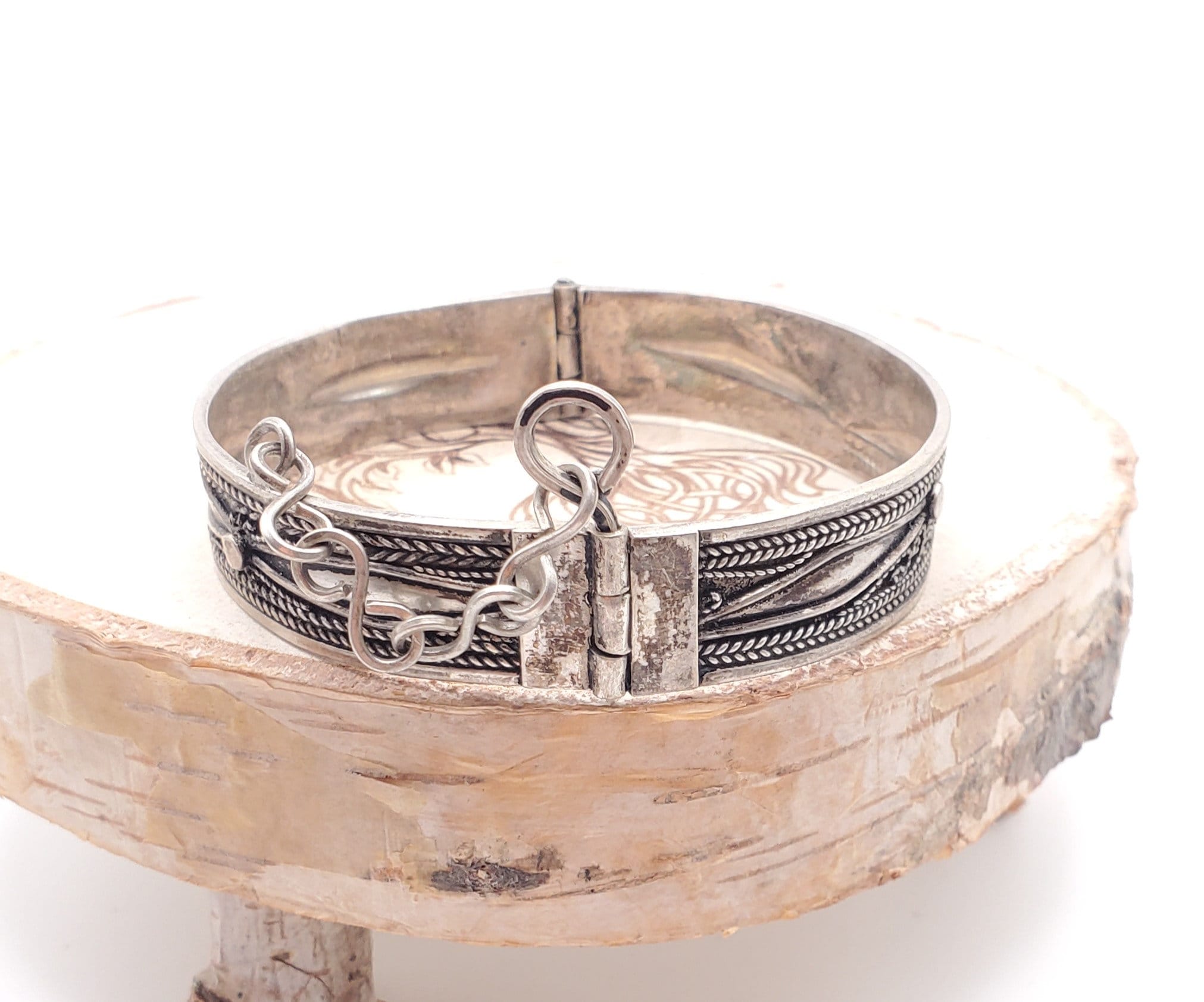 silver bracelet is a unique piece of Moroccan jewelry that showcases the intricate craftsmanship of the Berber tribe. traditional charm make it a timeless accessory that complements any outfit. The bracelet is made of fine sterling silver . This ethnic tribal bangle is a vintage item that is handmade in Morocco, making it an original and authentic piece of jewelry. Its features include ethnic, regional, and tribal themes, making it a perfect addition to any jewelry collection. This unisex bracelet is perfect for fashion enthusiasts who appreciate the beauty and elegance of antique jewelry. Measures just under 2''.5 wide (at the widest) and has an inner diameter of just over 7''x.22mm 40gr The bracelet is in excellent condition feature detailed wire-work high grade alloy of silver with wonderful wear