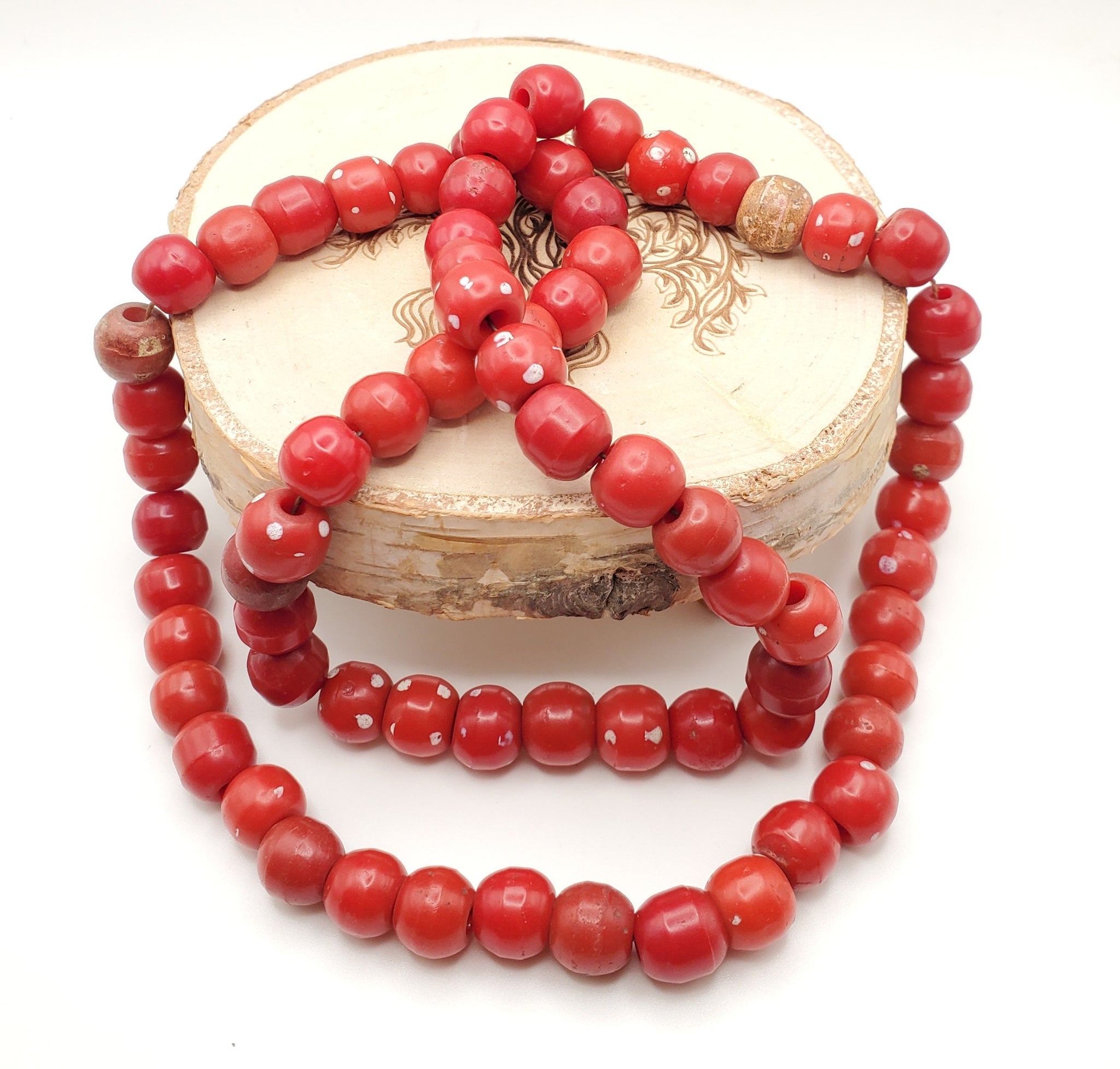 beautiful ancient Venetian Red and White Dot Skunks African Trade made in the late 19th centuries. They were made by winding white molten glass on a hot mandrel until the desired size was achieved. Then the glass artist would add small globules of white, red creating the many decorative eyes and This technique is known as one of the earliest forms of lamp work glass making. Although they were made in Venice, these particular beads were actually traded into Africa.