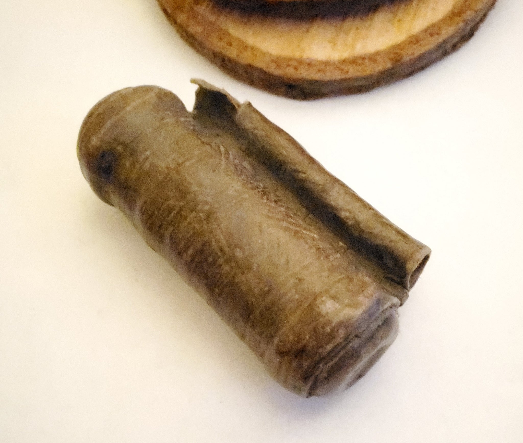 an antique Ethiopian scroll which has been encased and sewn into a leather talisman amulet for the purpose of every day wearable protection, healing and blessings. Each protective amulet also known as a Kitabe was made specifically for an individual for a focused reason and usually the scroll was made of goatskin which had been worked into parchment like material called vellum which was rolled or folded before being wrapped and sewn into the leather casing. Usually the writing on the scroll is in handmade black and red paint or ink and is written in Ethiopic Ge'ez a language no longer used except for religious purposes. The scrolls were inscribed by religious scribes, dabtaras (unordained clerics) or priests and contain Christian oriented prayers and / or stories or pertinent text from Ethiopian Christian Manuscripts / Bibles sometimes pictures are added.......africanbazaarus.com