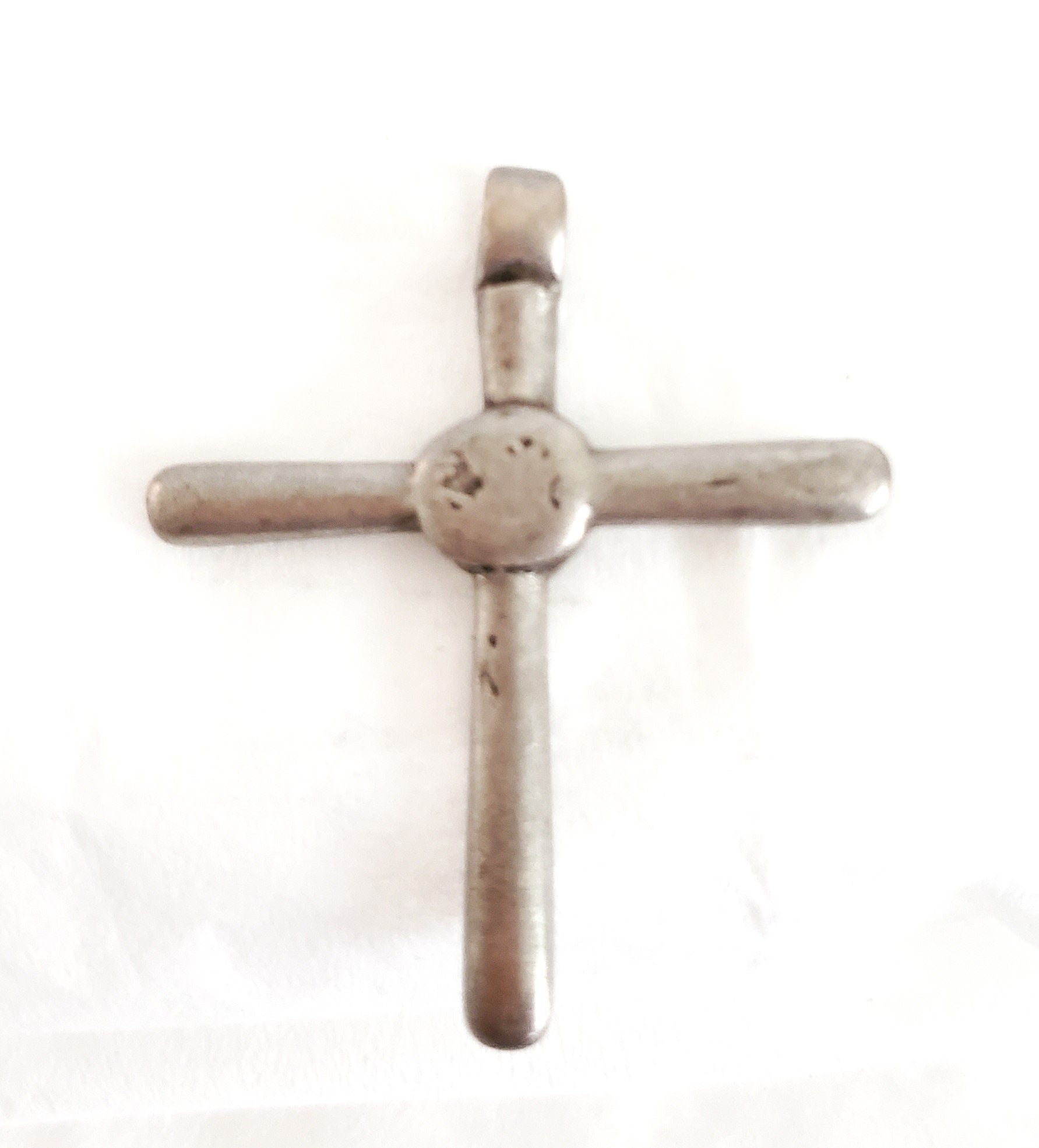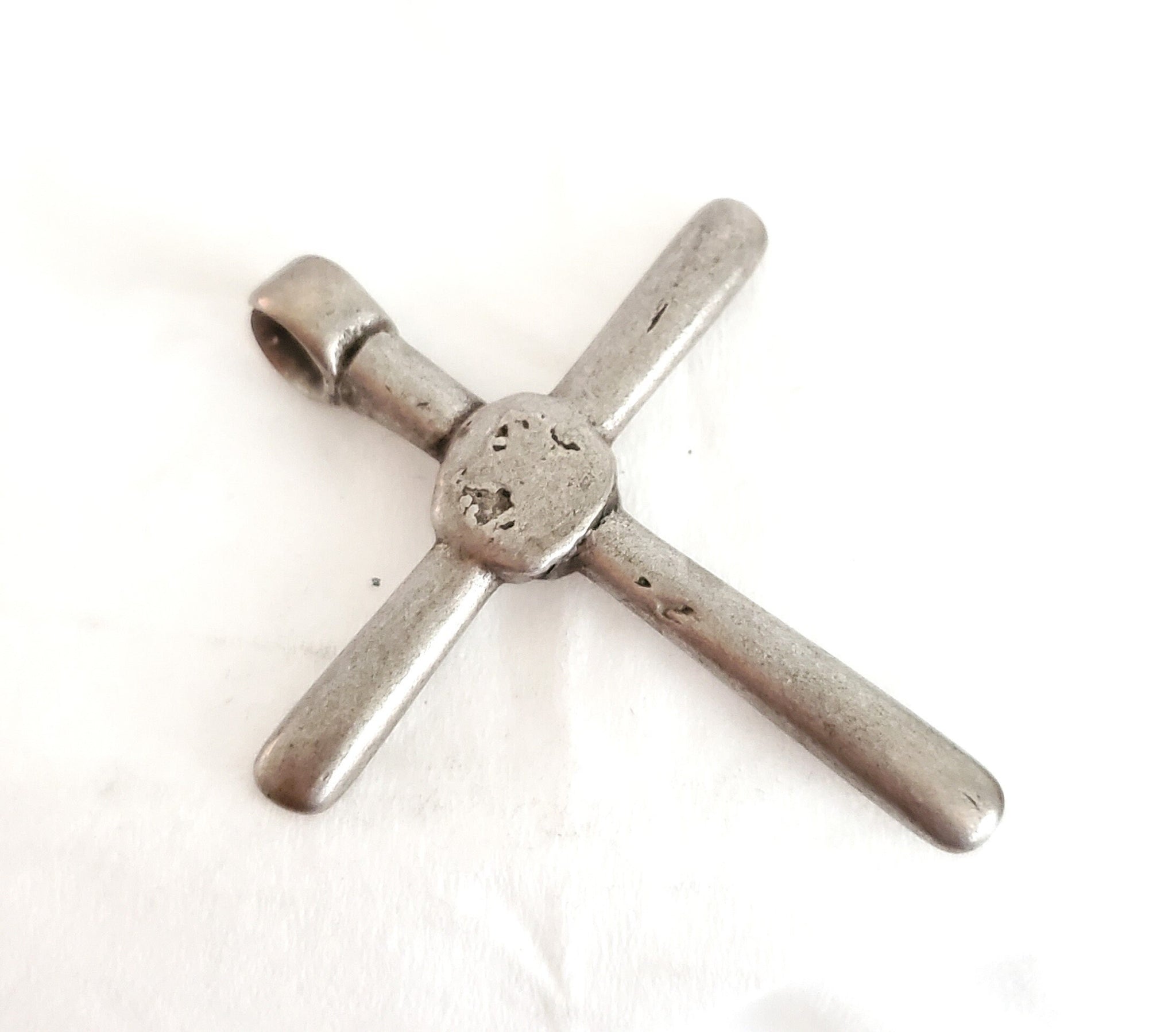 beautiful old handmade Ethiopian cross pendant made of silver . In Ethiopia particularly among Orthodox Church followers, to wear a cross implied to be protected by the lord himself as well as to show that they are a devoted Christian. Neck or pictorial crosses are tied round their owner's neck with a piece of blue thread or cord, which was sometimes given to the wearer at baptism. This particular cross pendant is old and has been used. Measures approximatelty 2" x 1''.5 long Age: over 100 great condition Collectible other shop .....africanbazaarus.com