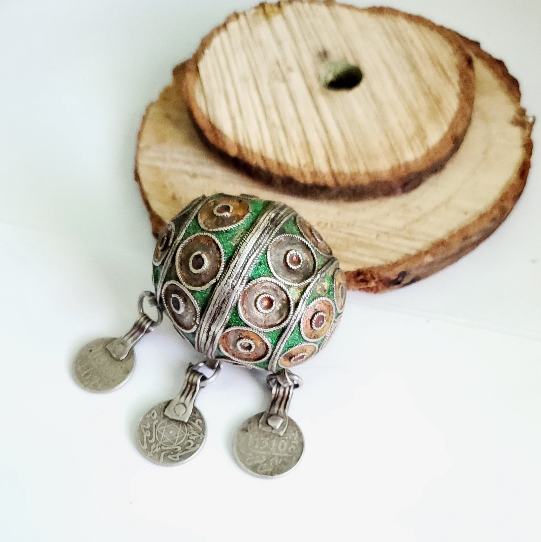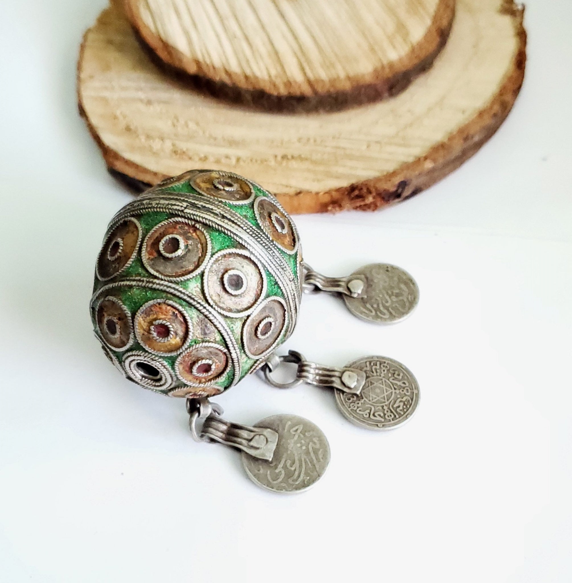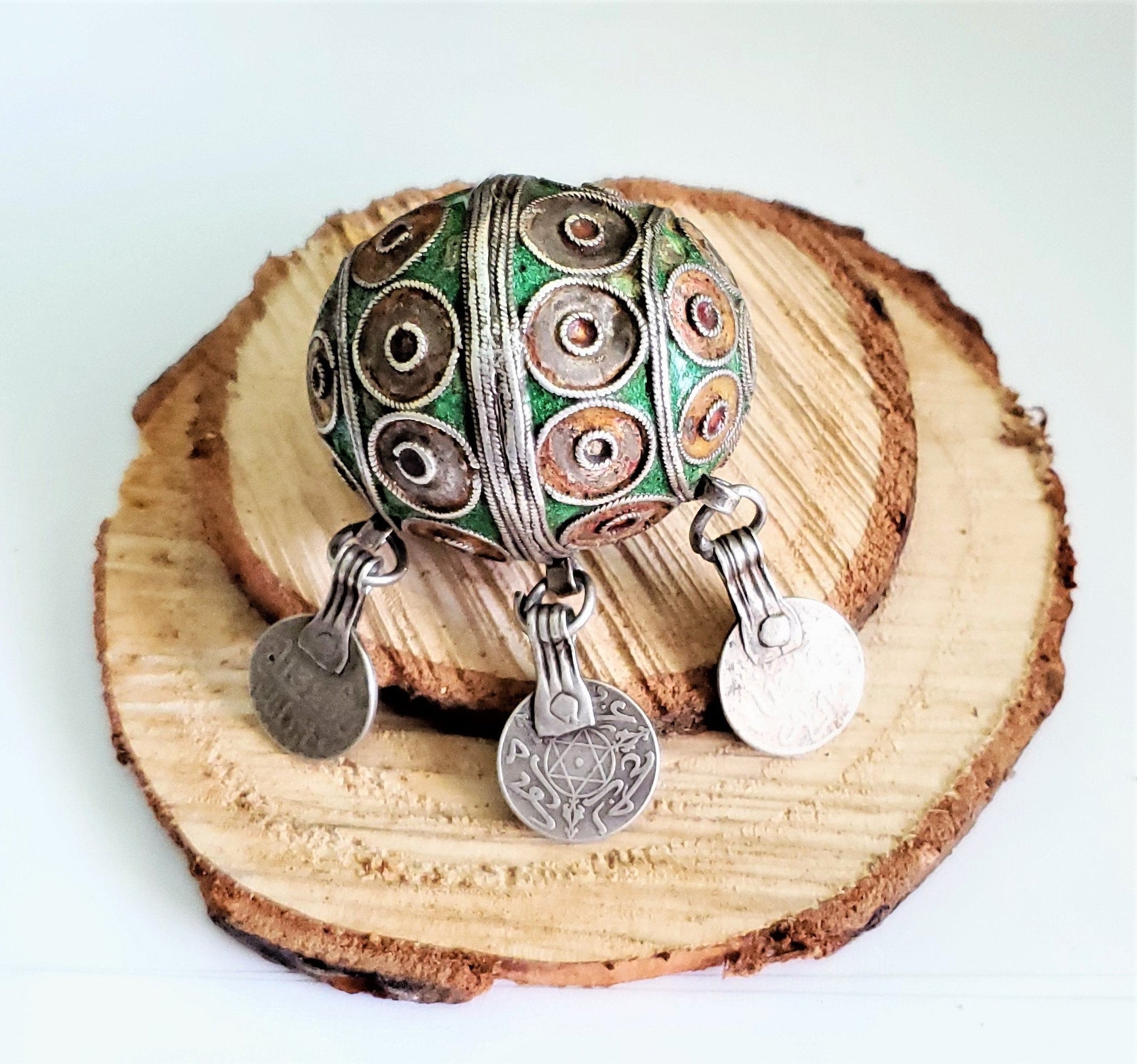 Antique Moroccan Enameled Silver Ball Pendent with 3 silver Coin Pendant Ball Pendent from Southern Morocco The silver ball come across Ornate patterns and top of the line workmanship. ! Weighs 45 grams and measures about 2".5 x 2".5 See the pictures for size comparison. The coins including the rings are about 1" additional in length. Definitely a collector's piece! great condition with age and use.