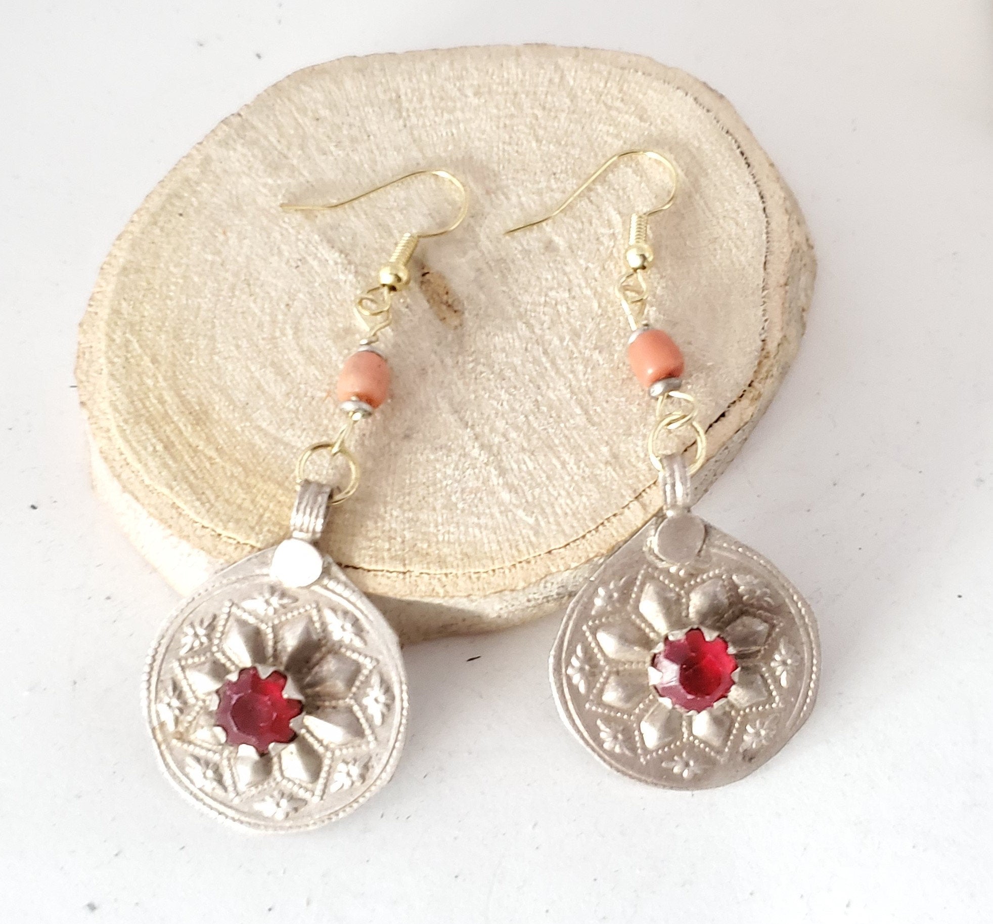 Antique Moroccan Old Silver pendants coral Earrings ,Ethnic Tribal, from Southern Morocco with real Mediterranean coral the Earring are traditional Berber silver rely good quality work YOU WILL HAVE A BEAUTIFUL AND UNIQUE PIECE OF HISTORY. IT DATES FROM THE 1960'S .It measures approximately 3'' long in 1'' wide .Weight 15 gr Earring features detailed enamel wire-work (see the photos) It is in good condition with age and use