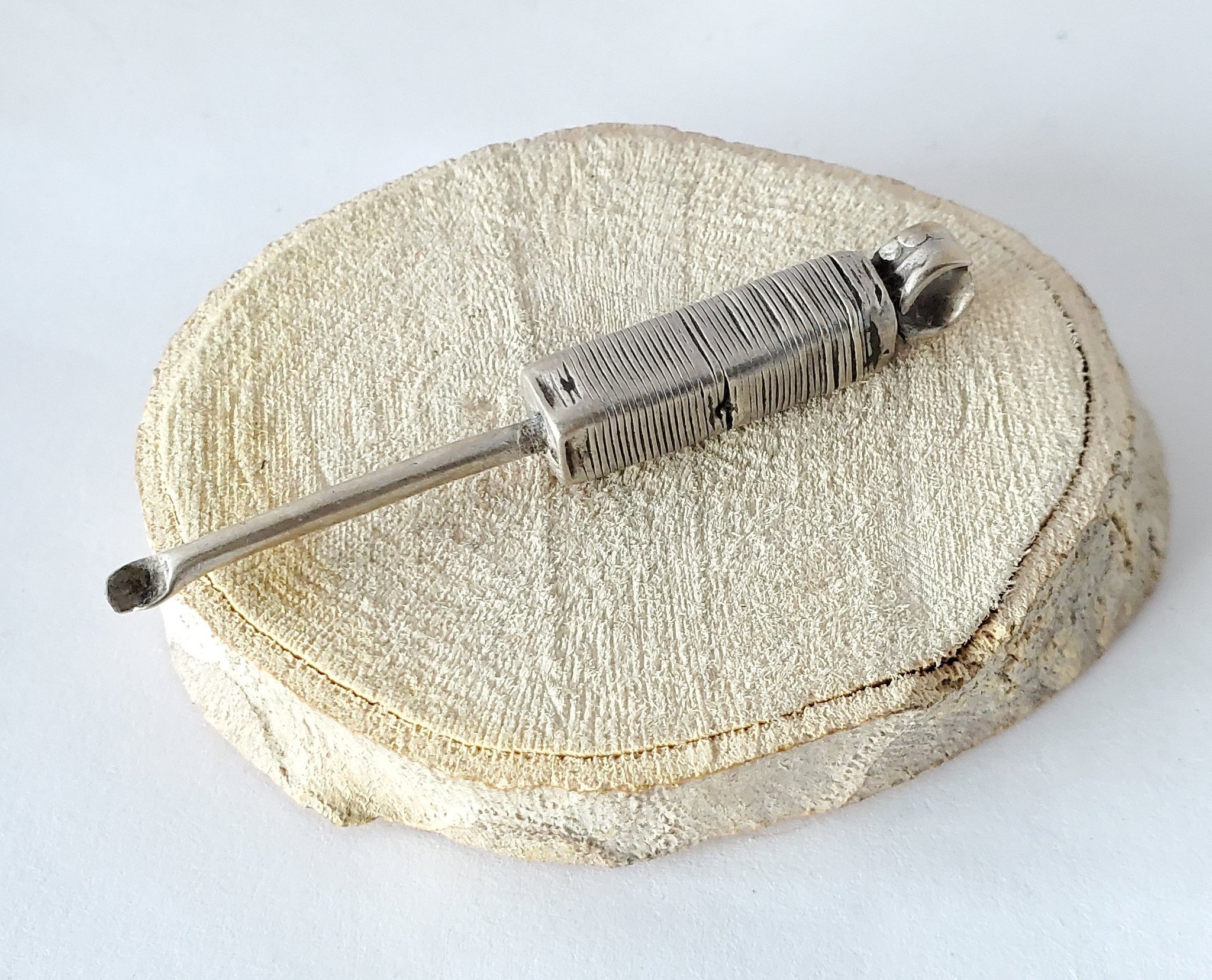 Antique silver grooming tool from Ethiopia or Yemen which would have been worn as a pendant and used to clean ears as needed. High silver content and over 100 years old! 2.5 long x .5"wide x 8mm thick with a large 22mm loop for stringing .very collectible and would be perfect for every day wear on a necklace or adding to your Ethiopian collection. CONTACT ME IF YOU WANT TO SEE MORE PIC I DO HAVE MORE THANK YOU