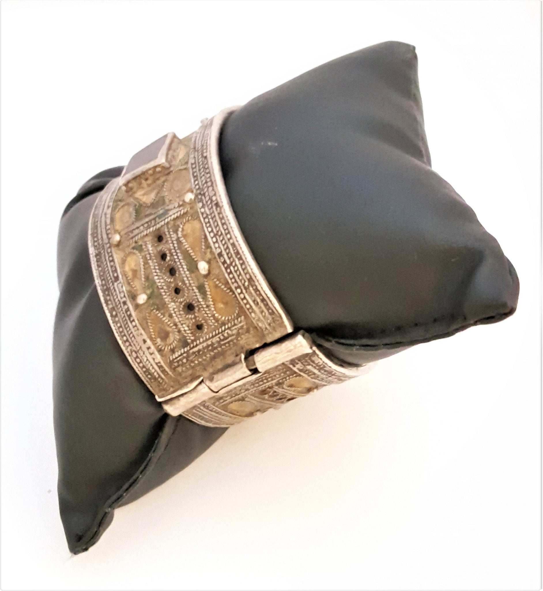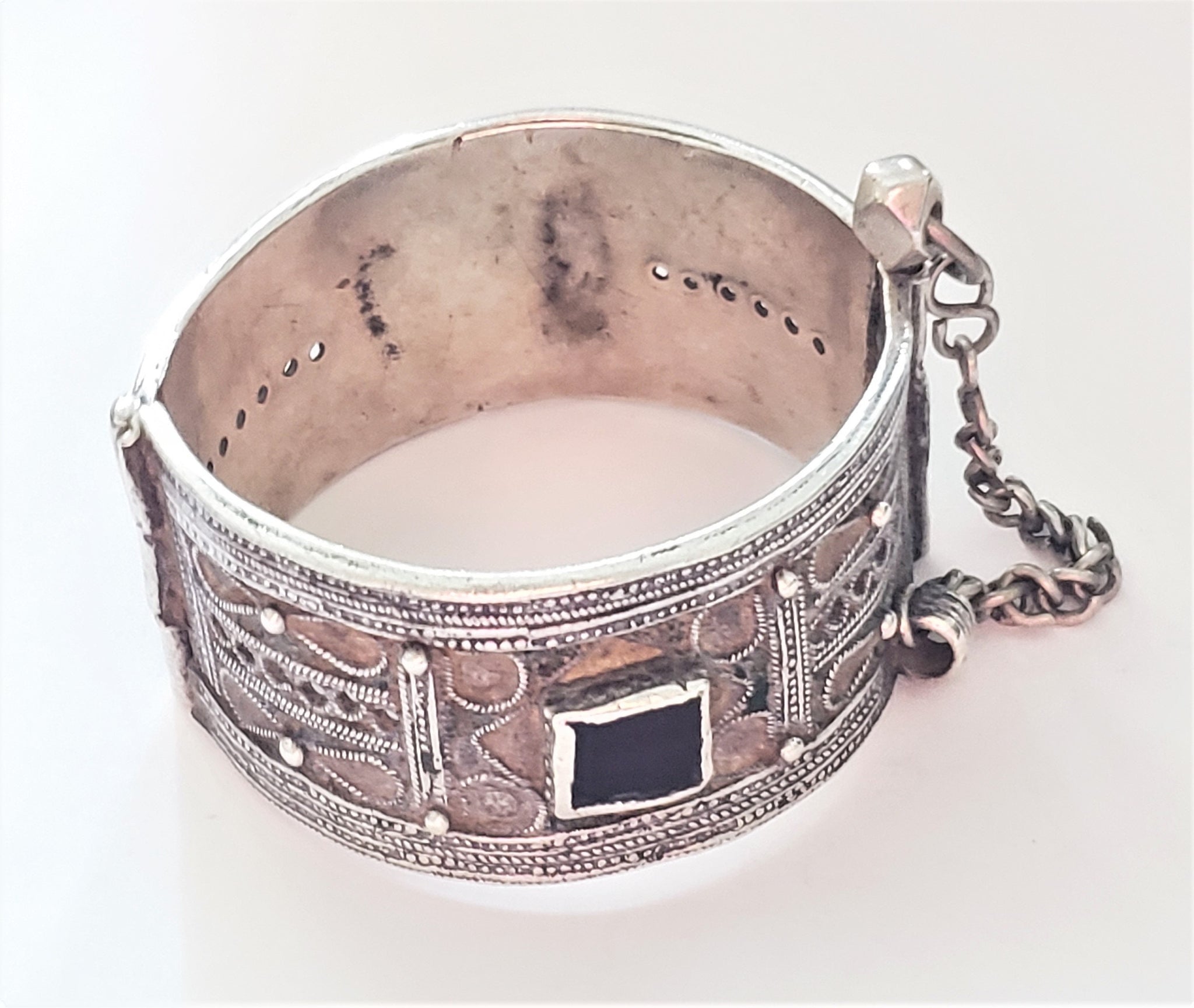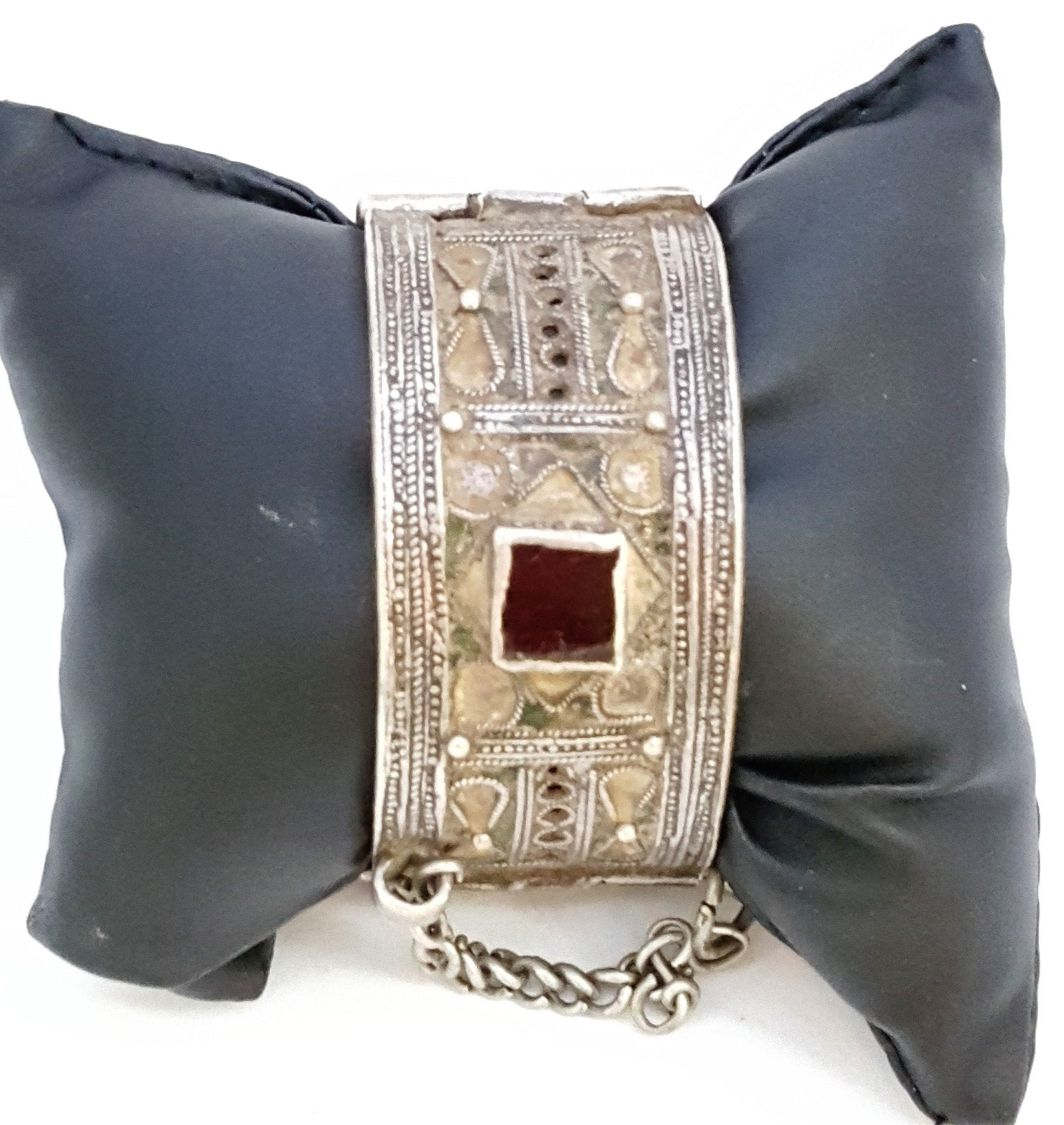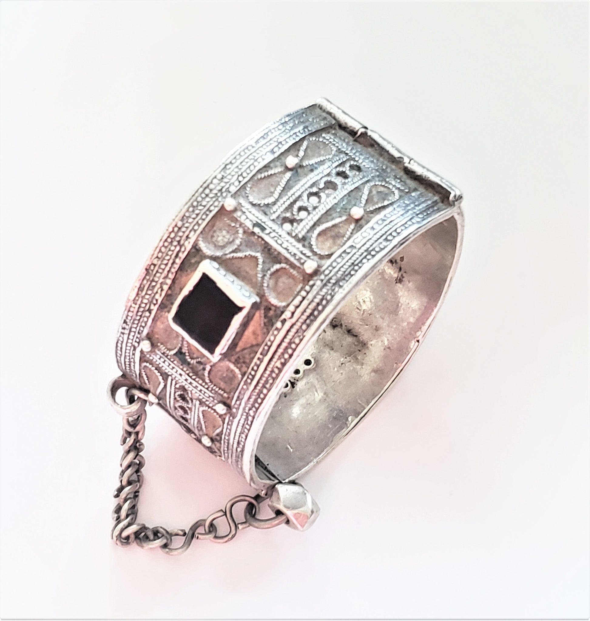 Antique Silver Moroccan Berber enamel Bracelet from Berber Tiznit, Morocco etched and decorated with silver enamel and with dark red glass inserts and Nice hefty clasp with safety chain from the Early 19th century.