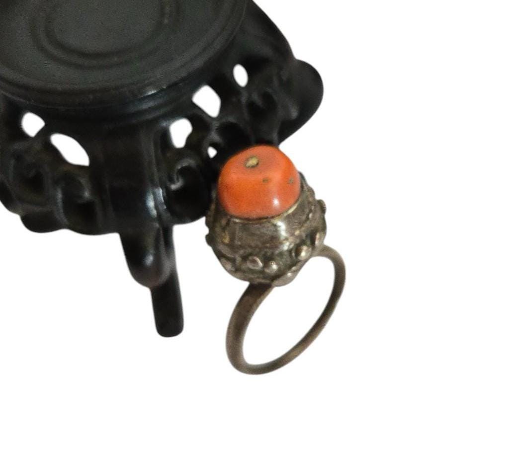 vintage Yemeni Jewish Bawsani Silver ring with red coral from Yemen from the 1910 century the decoration is made using genuine vintage red coral from the Mediterranean Sea Original Yemeni Jewish Ring from the early 1900 century, made by the best artisans in North Yemen. This ring shows the classic Bedihi granulation technique. The Bedihi´s were responsible for the best quality granulation work like this ring, and also all kind of berry Yemeni beads. The decor is made with vintage red coral Unique Yemeni wedding Ring size 7.5 ‘‘.5 x ‘‘.5 Weight:15 gr.Good condition size (see pictures) Collectible It is not marked but acid tested positive for 925 Silver,