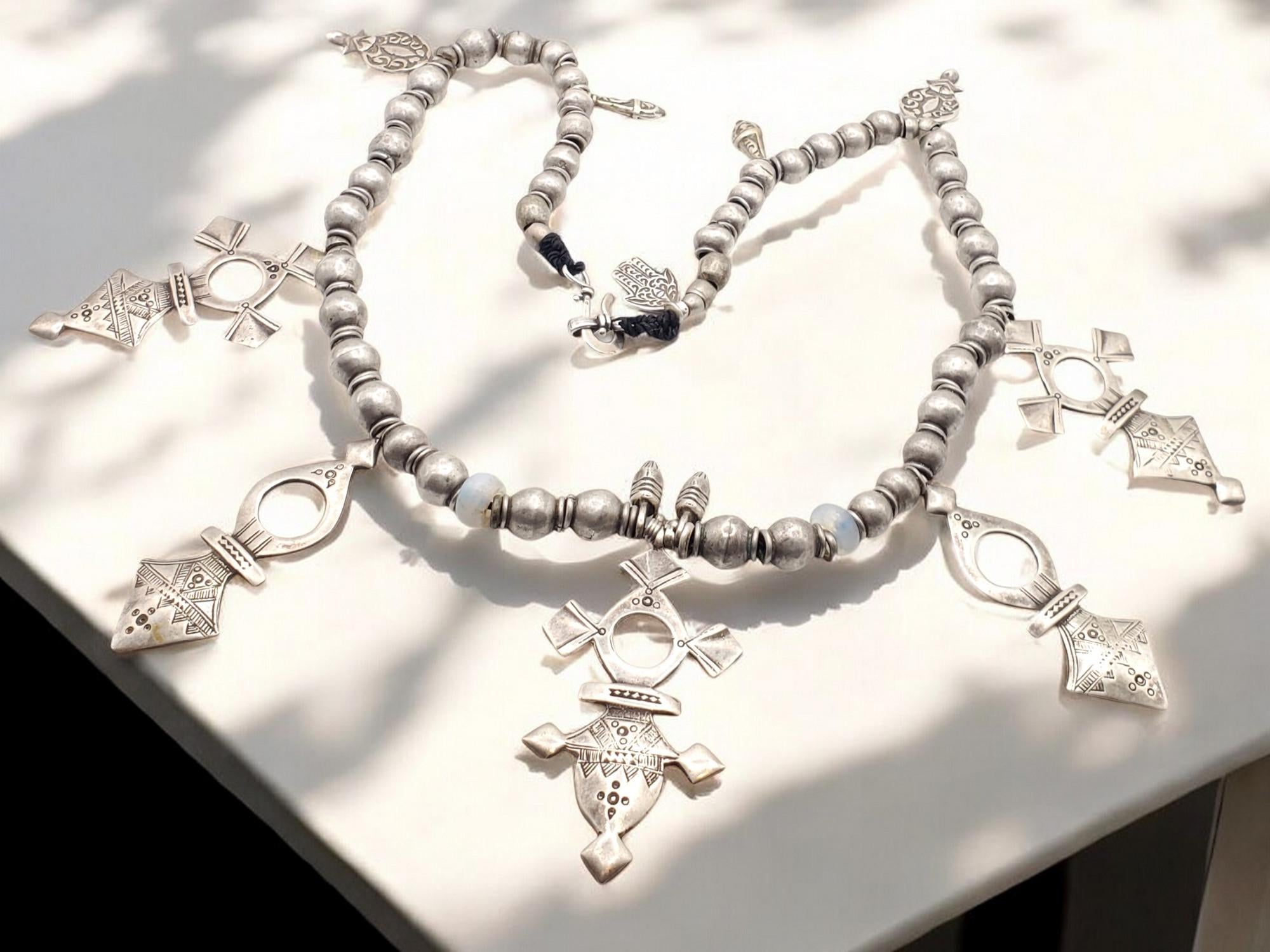 handmade silver Tuareg Necklace with Old 1960s silver beads the silver look much better than in the picc abut 3" x 1.5 long x 20" wide sterling silver 925 The Native people of North Africa are called Imazighen (Amazigh for singular), where we can find different dialects such as Kabyle, Tuareg, Chawi, Shelhi, Amazigh, Rifa, Mouza bit, etc. The Tuaregs refers then to the Amazigh/Berber people of the Sahara Desert Algeria, they are specialized in a lot of handcrafted artifacts such as leather products, Berber Rugs, and Silver Tuareg Jewlery with natural stones for hundreds of years. They excel in it all in keeping its traditional aspect, they are never mass produced, and they are never identical as they have always been handmade one by one. This piece it‘s in its original settings other shop......africanbazaarus.com