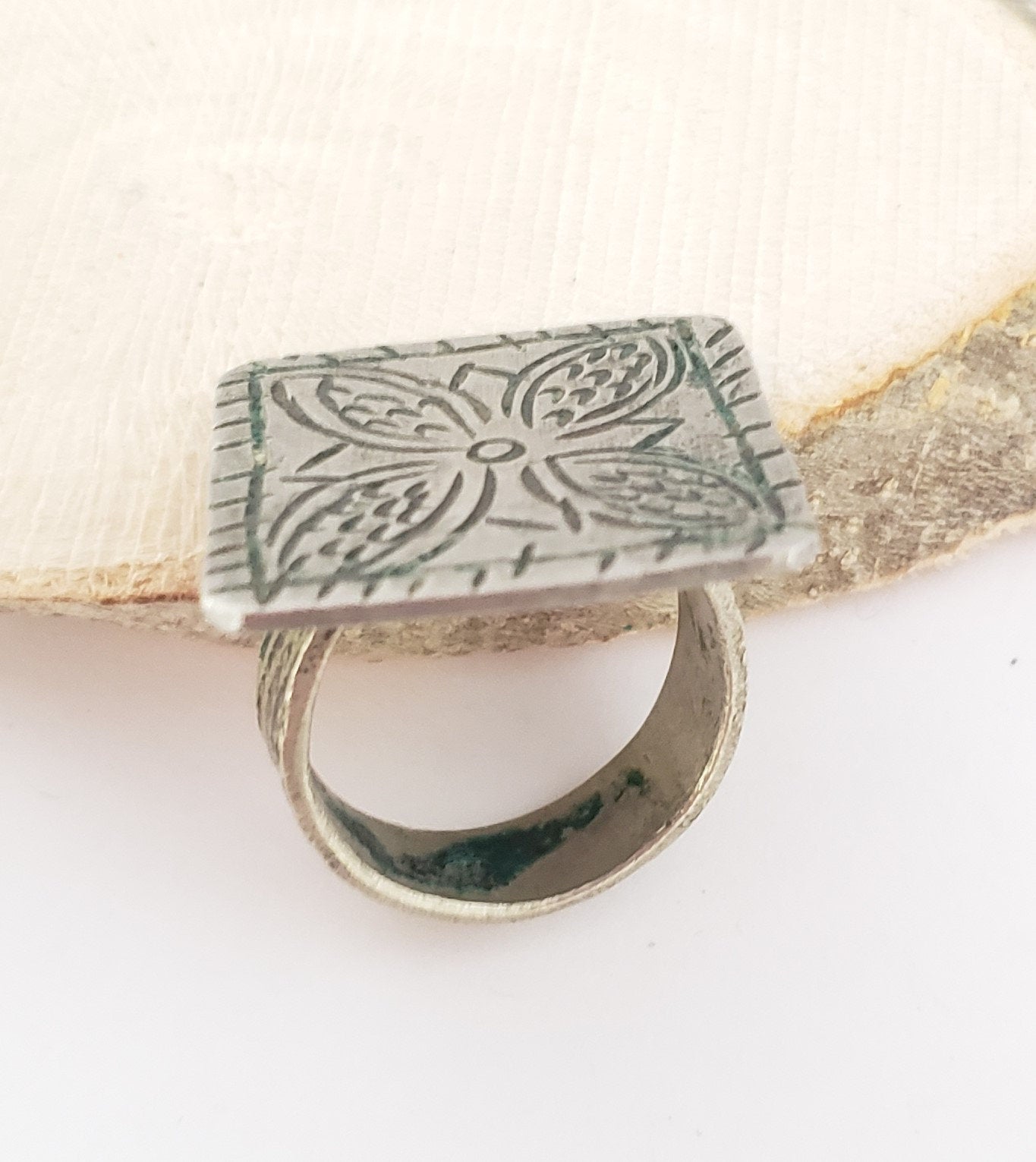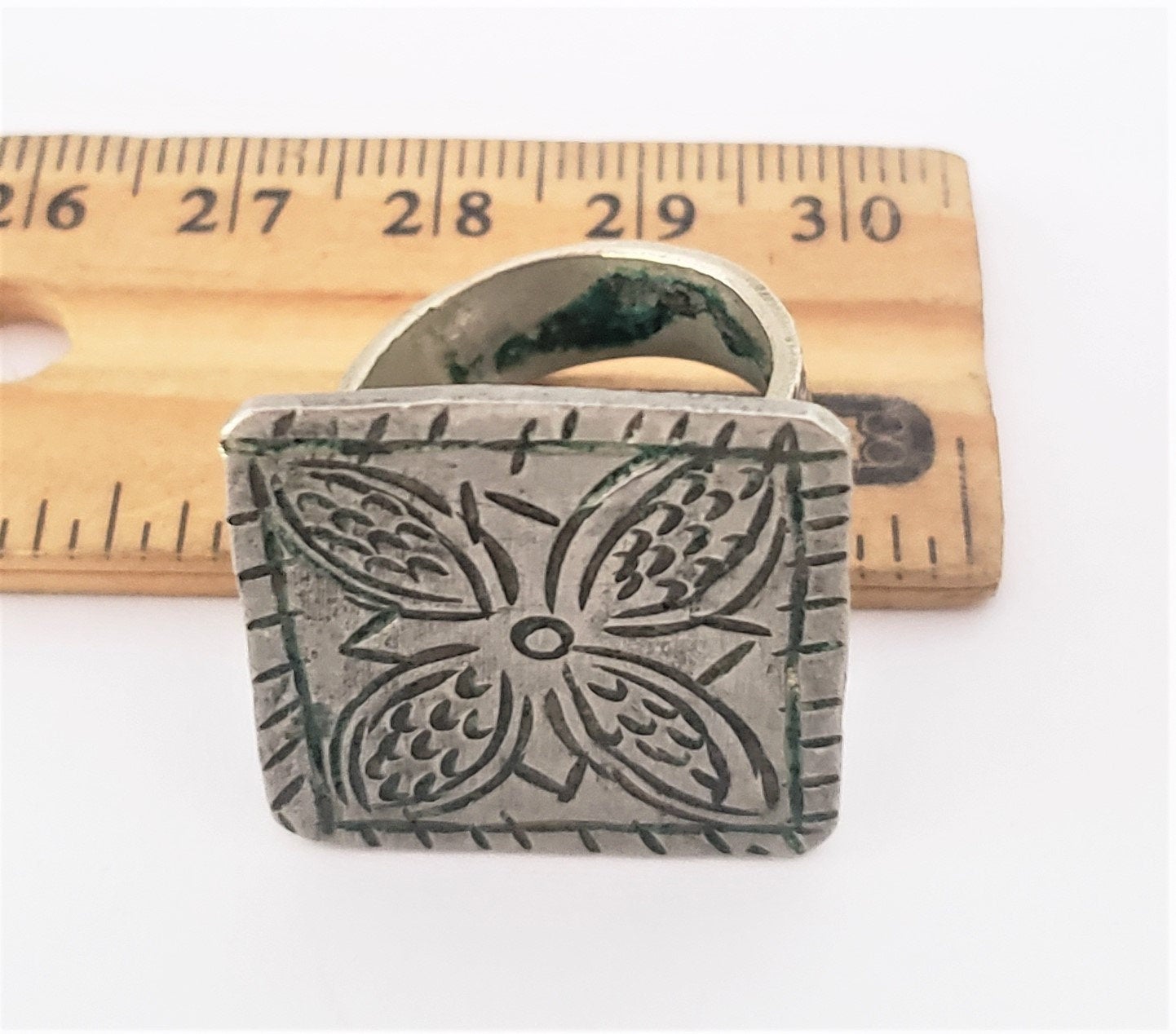 Moroccan antique Tuareg Hand Made SILVER RING This is an old Tuareg silver rings from a Tuareg tribesman in the Sahara Desert. Made from old silver age has given this ring a beautiful and unique patina. The Tuareg are a semi-nomadic people who have lived in the Sahara desert for hundreds of years, famed for their craftsmanship, they wear silver jewellery as a symbol of wealth and status, traditionally gold is deemed to bring bad luck! This ring is approximately size 8 11gm Measurements: The top of the ring is 1” long by 1” wide This is a stunning and rare original ethnic African jewellery. vintage, unique high-silver content ring from morocco Collectible CONTACT ME IF YOU WANT TO SEE MORE PIC I DO HAVE MORE THANK YOU other shop https://www.etsy.com/shop/Africanbazar2US?ref=seller-platform-mcnav