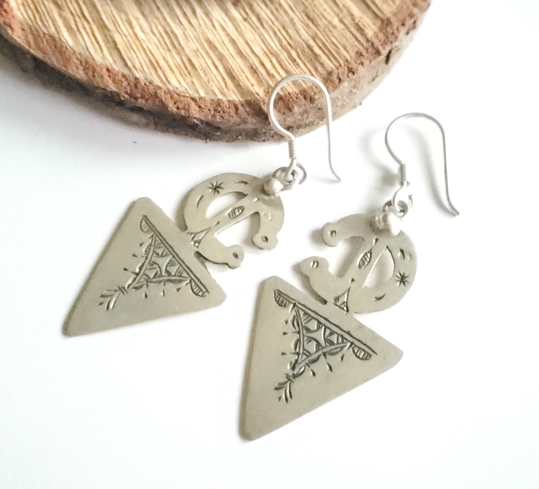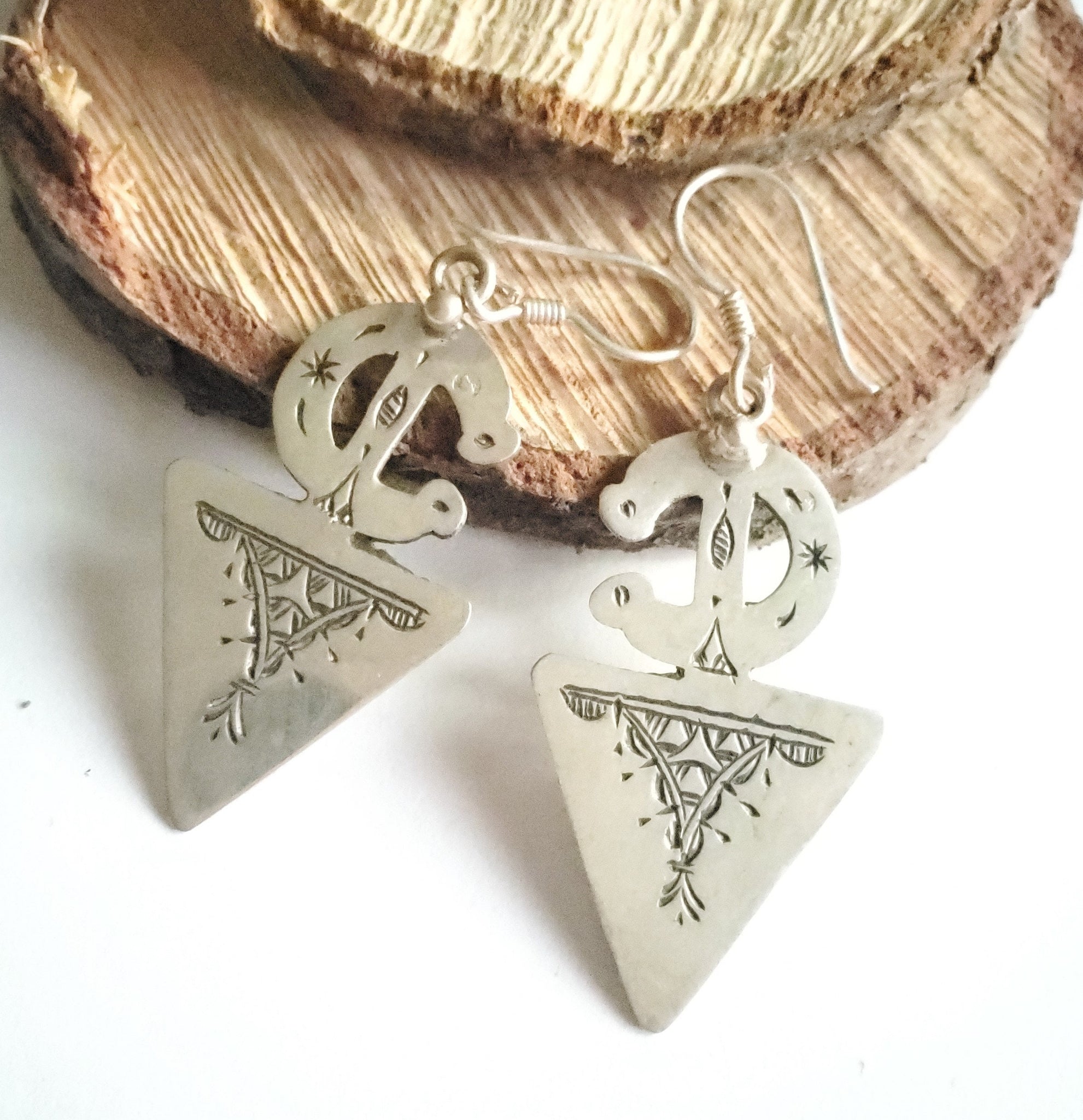 Moroccan Berber Fibula Dangle & Drop Sterling Silver Earrings This is a great authentic Berber jewelry from Morocco. Each Fibula earring measures just over 2" .5 long and just under 1'' .5 wide./ 13.gr The workmanship is wonderful .These earrings were hand made sterling silver 925 new high-silver content if you have any questions - Feel free to contact me. . Thank you for visiting my shop All my jewelry has been collected over 20 years ago .I will be listing more pieces shortly as I am constantly always working on posting more. piece to add to the collection .I ship all over the world and price includes a tracking service.