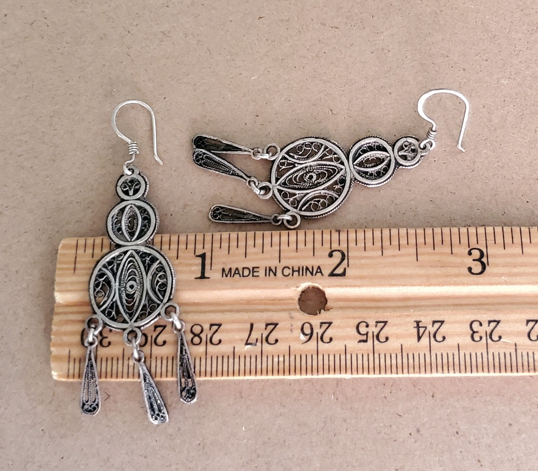 Moroccan Berber Filigree Sterling Silver Dangle Earrings This is a great authentic Filigree jewelry from Morocco. Each earring measures just over 2" long and just under 1'' wide./ 11.gr The workmanship is wonderful .These earrings were hand made sterling silver 925 new high-silver content if you have any questions - Feel free to contact me. . Thank you for visiting my shop All my jewelry has been collected over 20 years ago .I will be listing more pieces shortly as I am constantly always working on posting more. piece to add to the collection .I ship all over the world and price includes a tracking service.