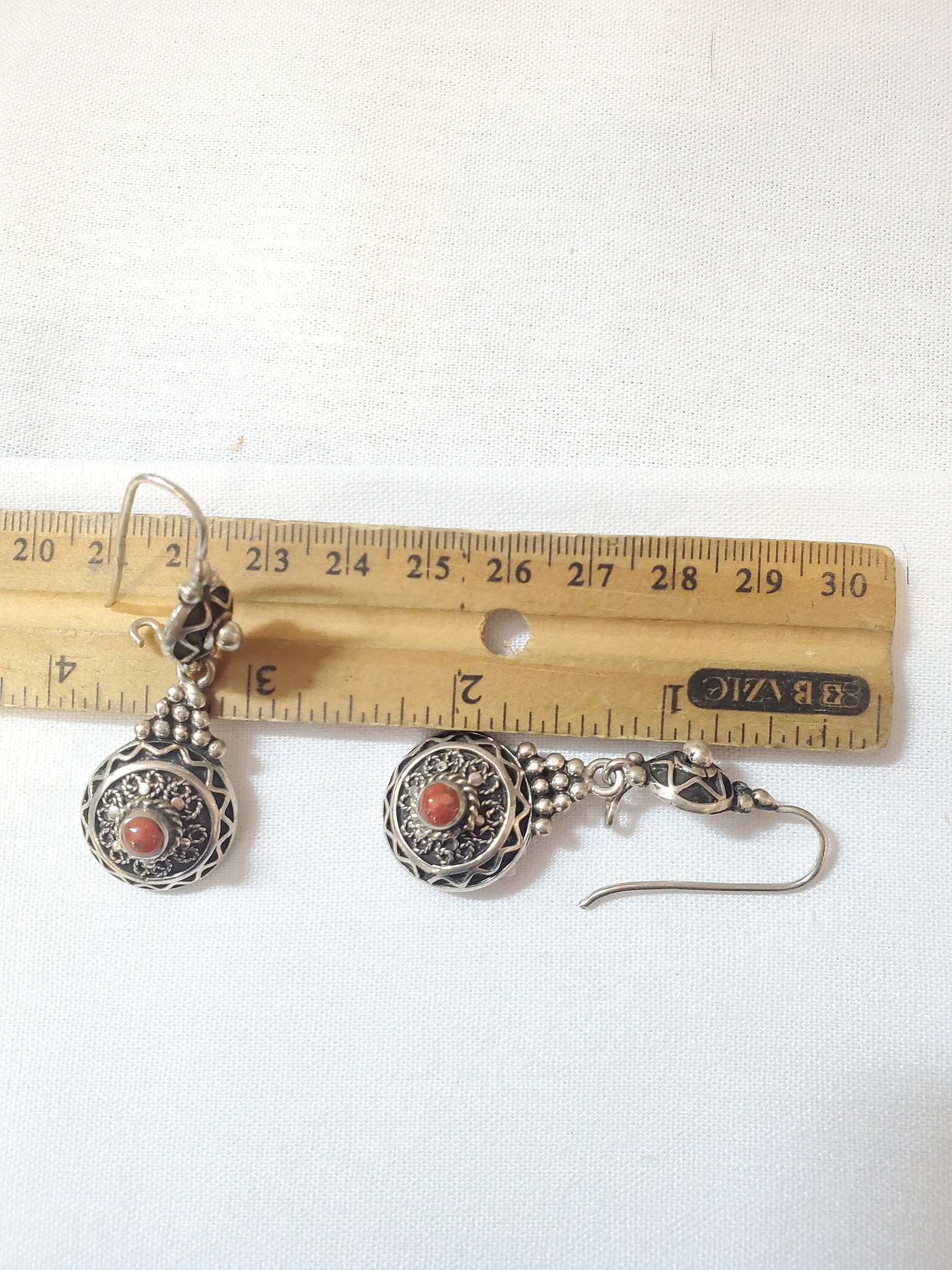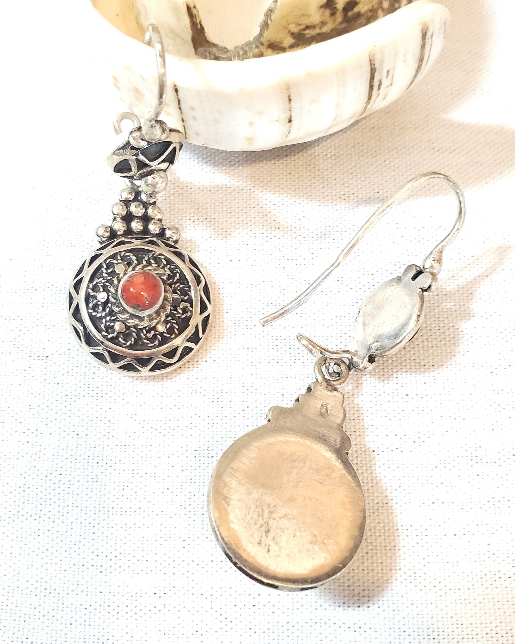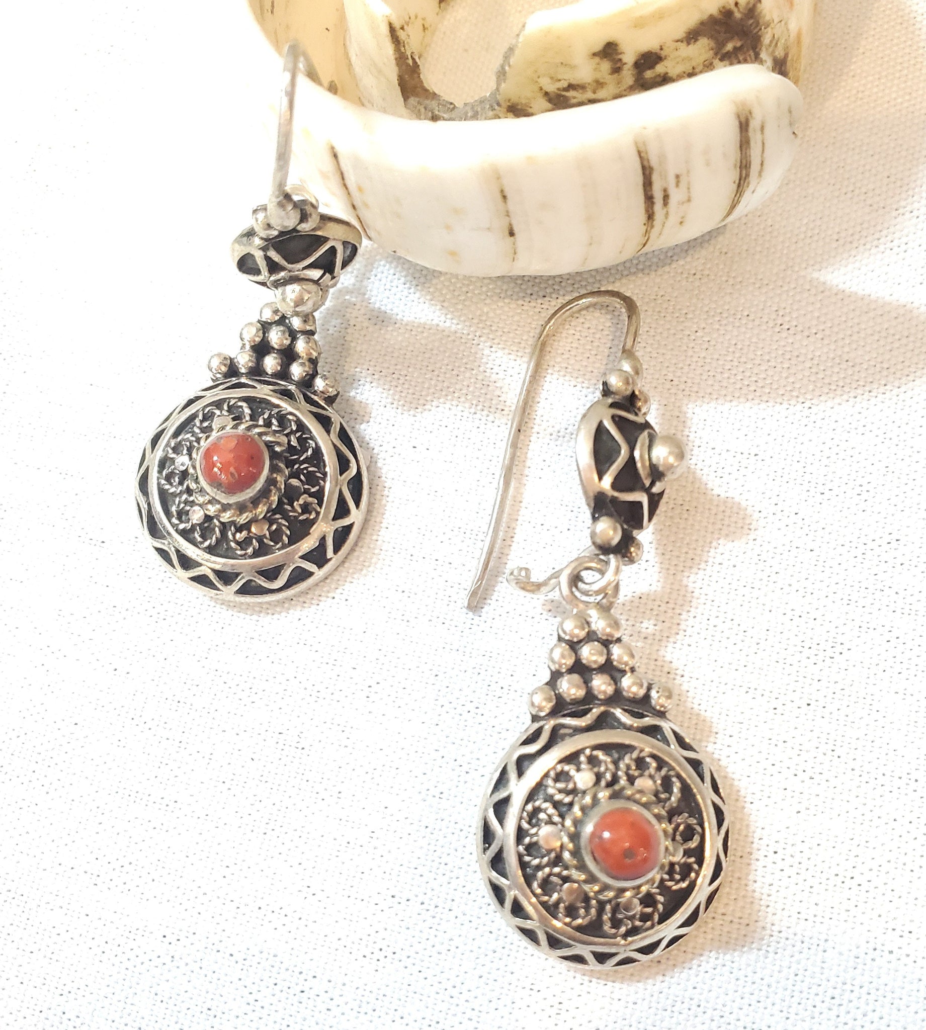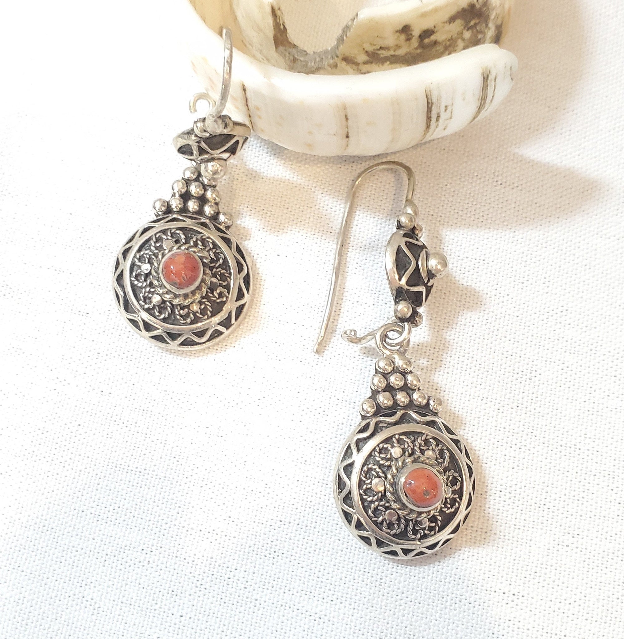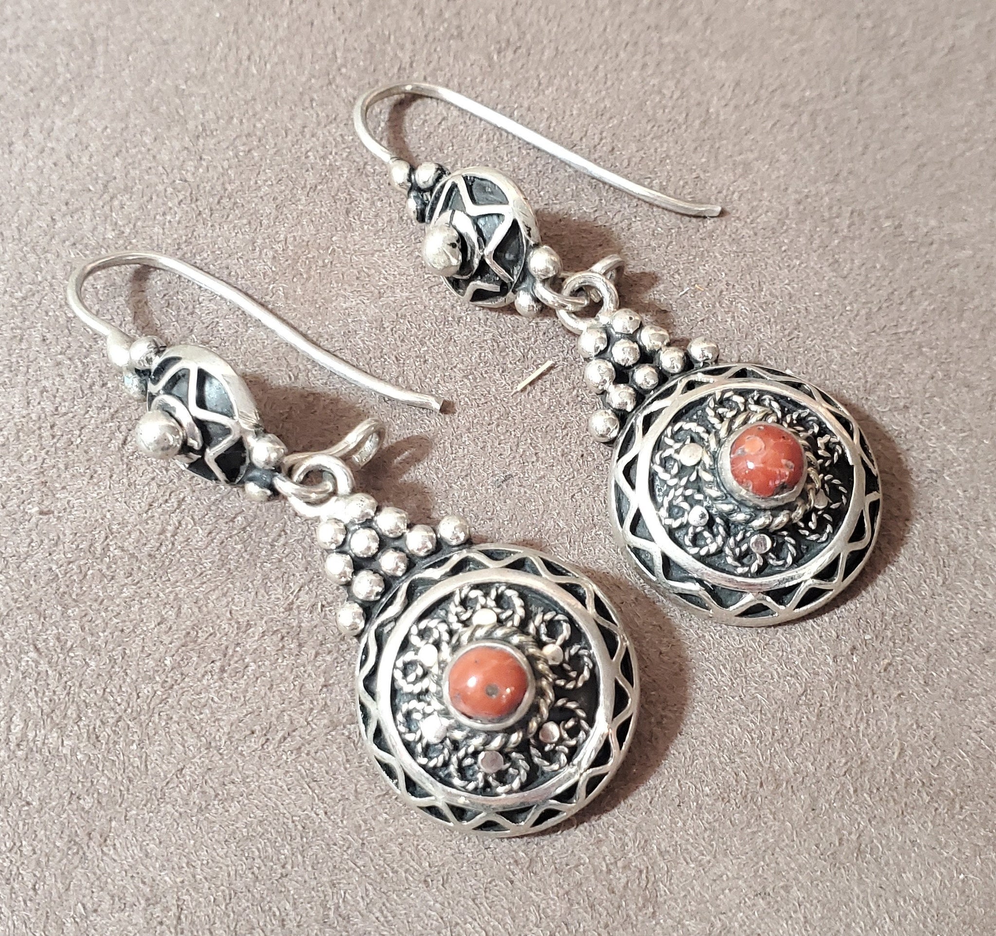 Moroccan Berber Dangle Earrings with Coral Sterling Silver red coral This is a great authentic jewelry from Morocco. Each earring measures just over 2.5" long and just under 1''.5 wide./ 28.gr The workmanship is wonderful. These earrings were hand made sterling silver 925 new high-silver content if you have any questions - Feel free to contact me. . Thank you for visiting my shop All my jewelry has been collected over 20 years ago .I will be listing more pieces shortly as I am constantly always working on posting more. piece to add to the collection .I ship all over the world and price includes a tracking service.