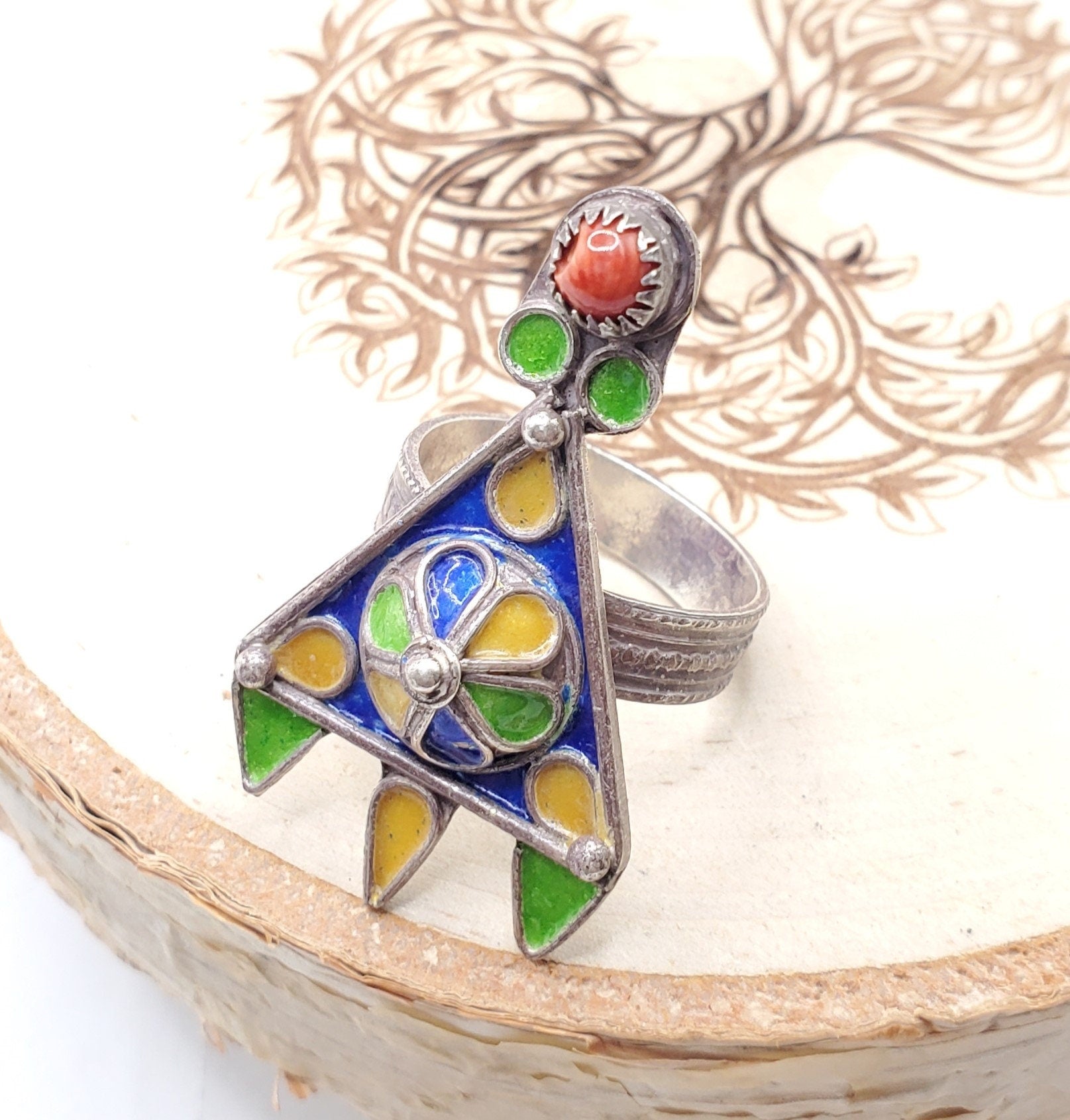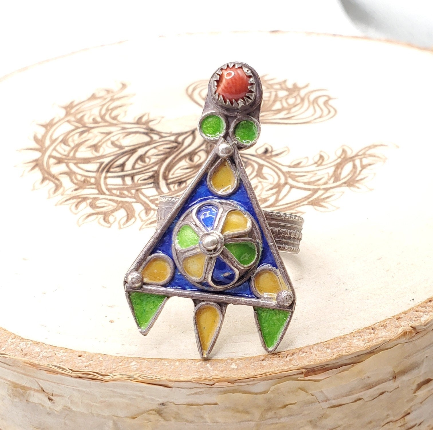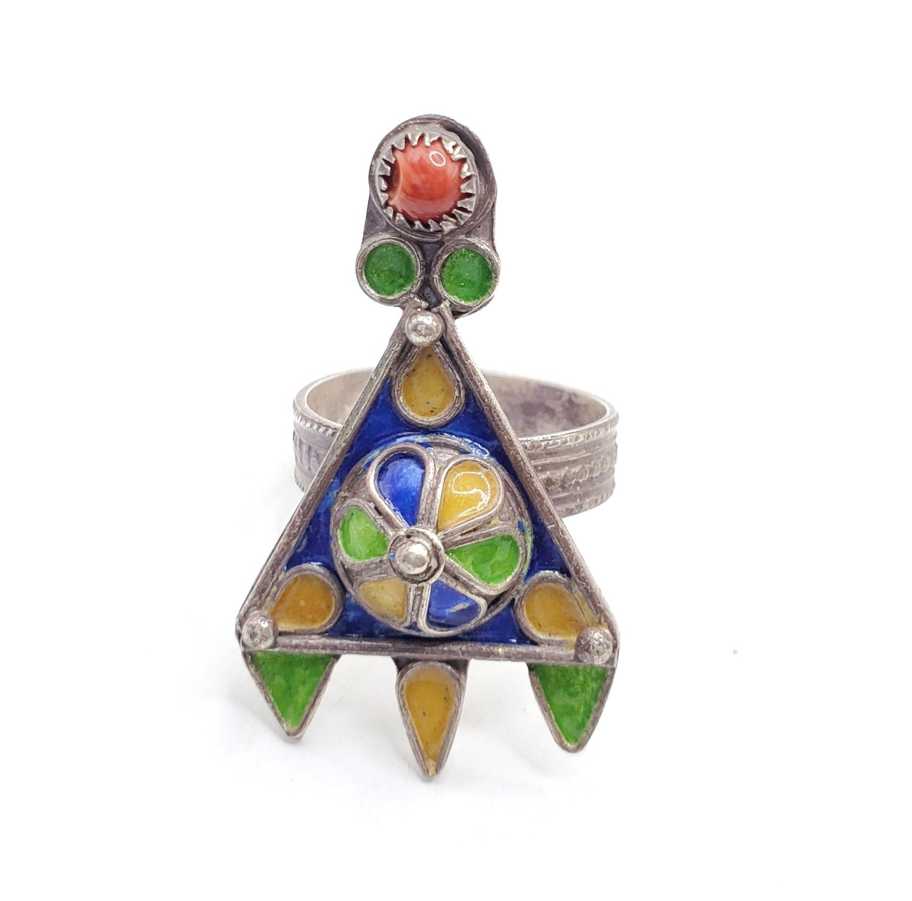 Moroccan Talismanic Berber Silver Enamel Ring size 8.5 This is a classic old design from the Berber their craftsmanship, Talismanic Ring Engraved to Increase Power and Authority