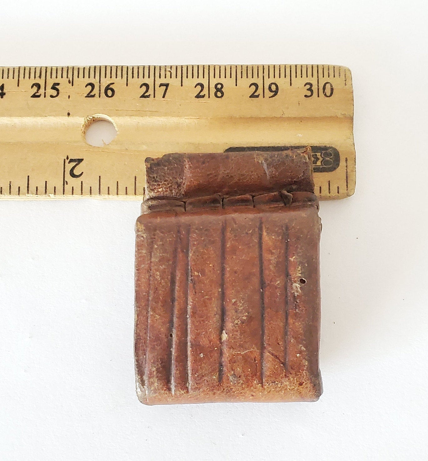 an antique Ethiopian scroll which has been encased and sewn into a leather talisman amulet for the purpose of every day wearable protection, healing and blessings. Each protective amulet also known as a Kitabe was made specifically for an individual for a focused reason and usually the scroll was made of goatskin which had been worked into parchment like material called vellum which was rolled or folded before being wrapped and sewn into the leather casing. Usually the writing on the scroll is in handmade black and red paint or ink and is written in Ethiopic Ge'ez a language no longer used except for religious purposes. The scrolls were inscribed by religious scribes, dabtaras (unordained clerics) or priests and contain Christian oriented prayers and / or stories or pertinent text from Ethiopian Christian Manuscripts / Bibles sometimes pictures are added other shop