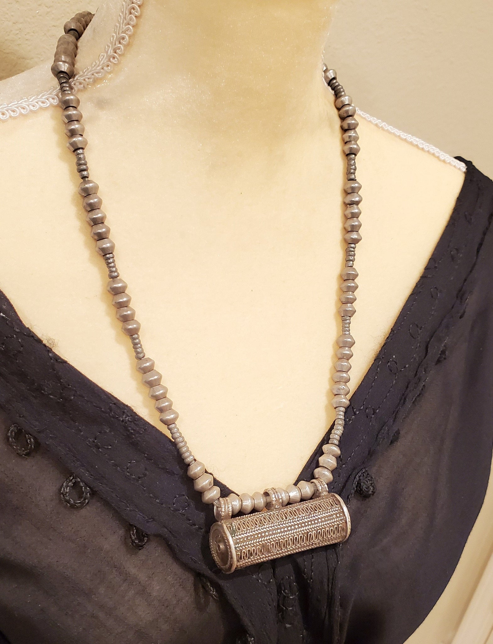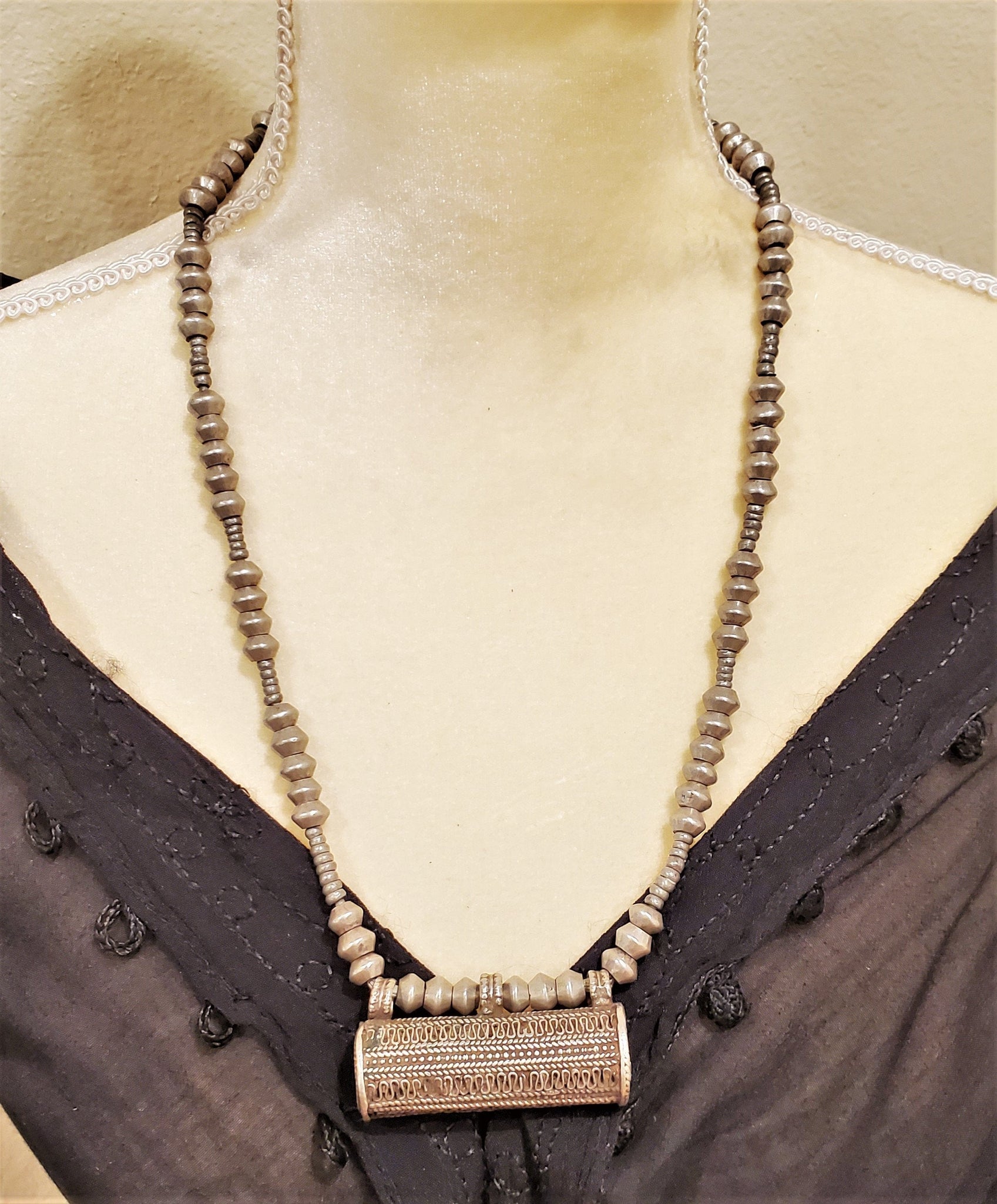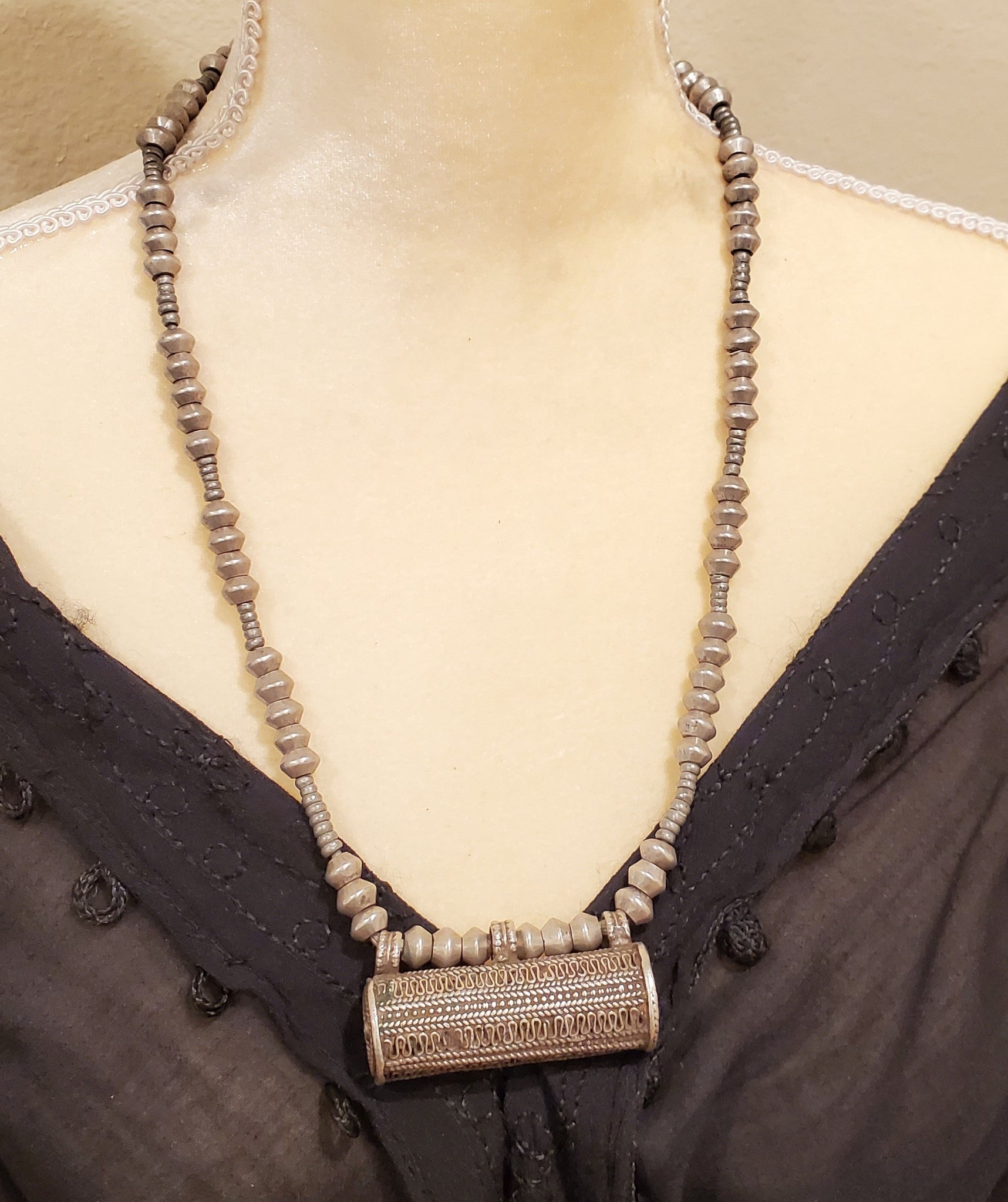 beautiful Old Hand Crafted Ethiopian Beads Necklace, featuring Telsum Silver amulet Pendant,