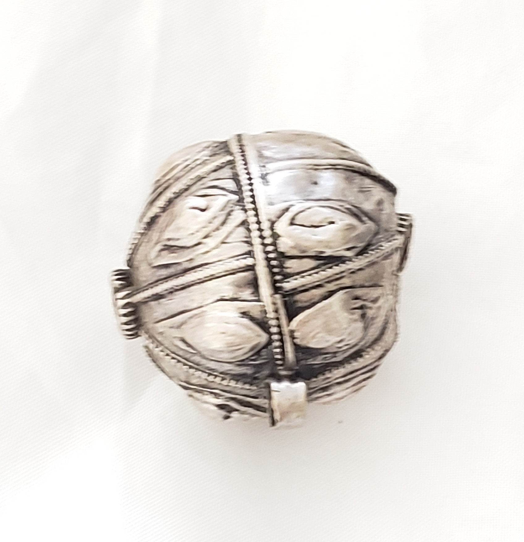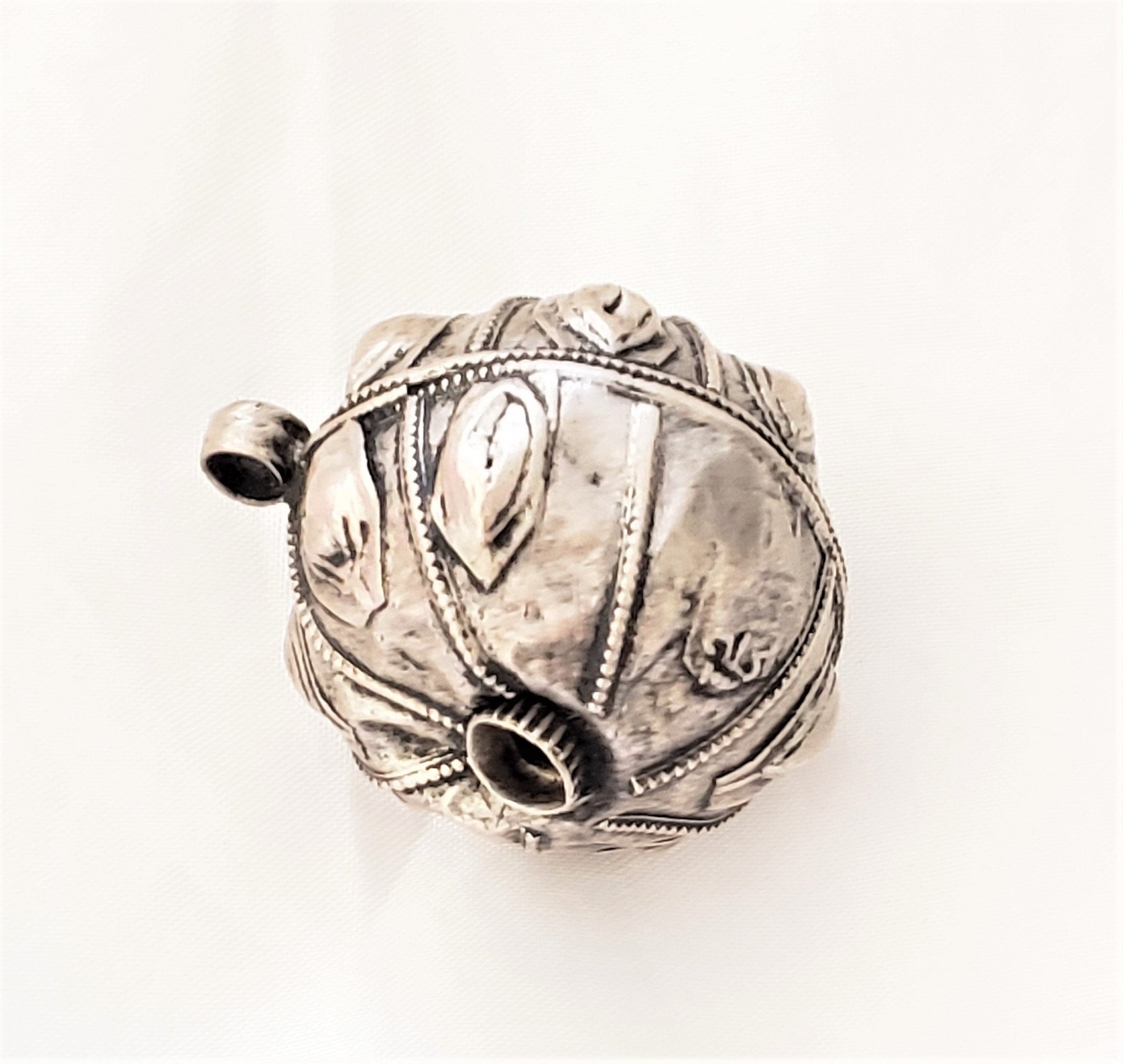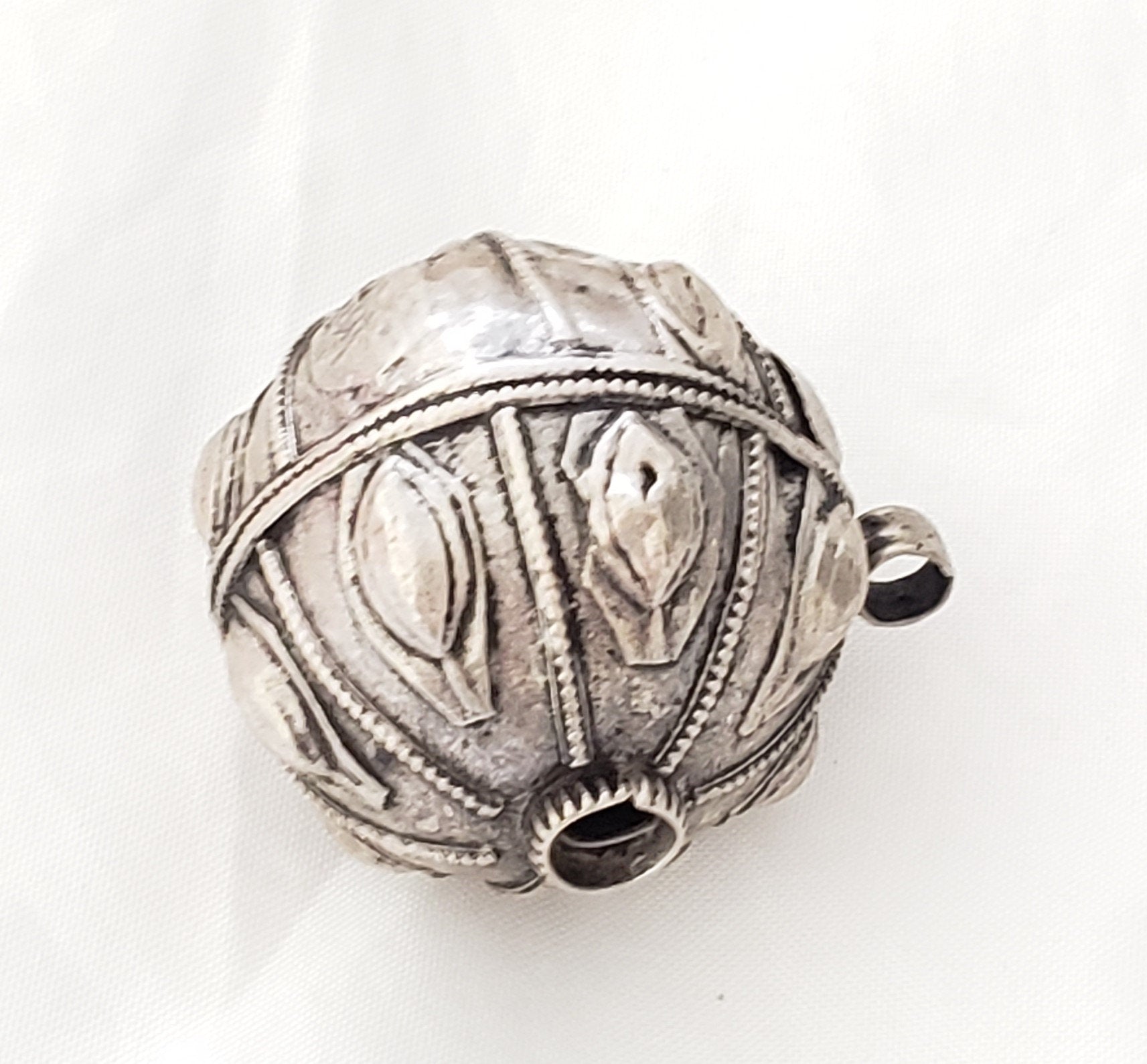 old silver hallmarked beads from Yemen, circa 1910s. Rare with intricate silver smiting Beautifully made, decorated and shaped. Good alloy of silver. Old pieces with beautiful patina,This kind of ones. Good condition Collectible and useful as jewelry supplies Measures:1''.5 x 1''.5