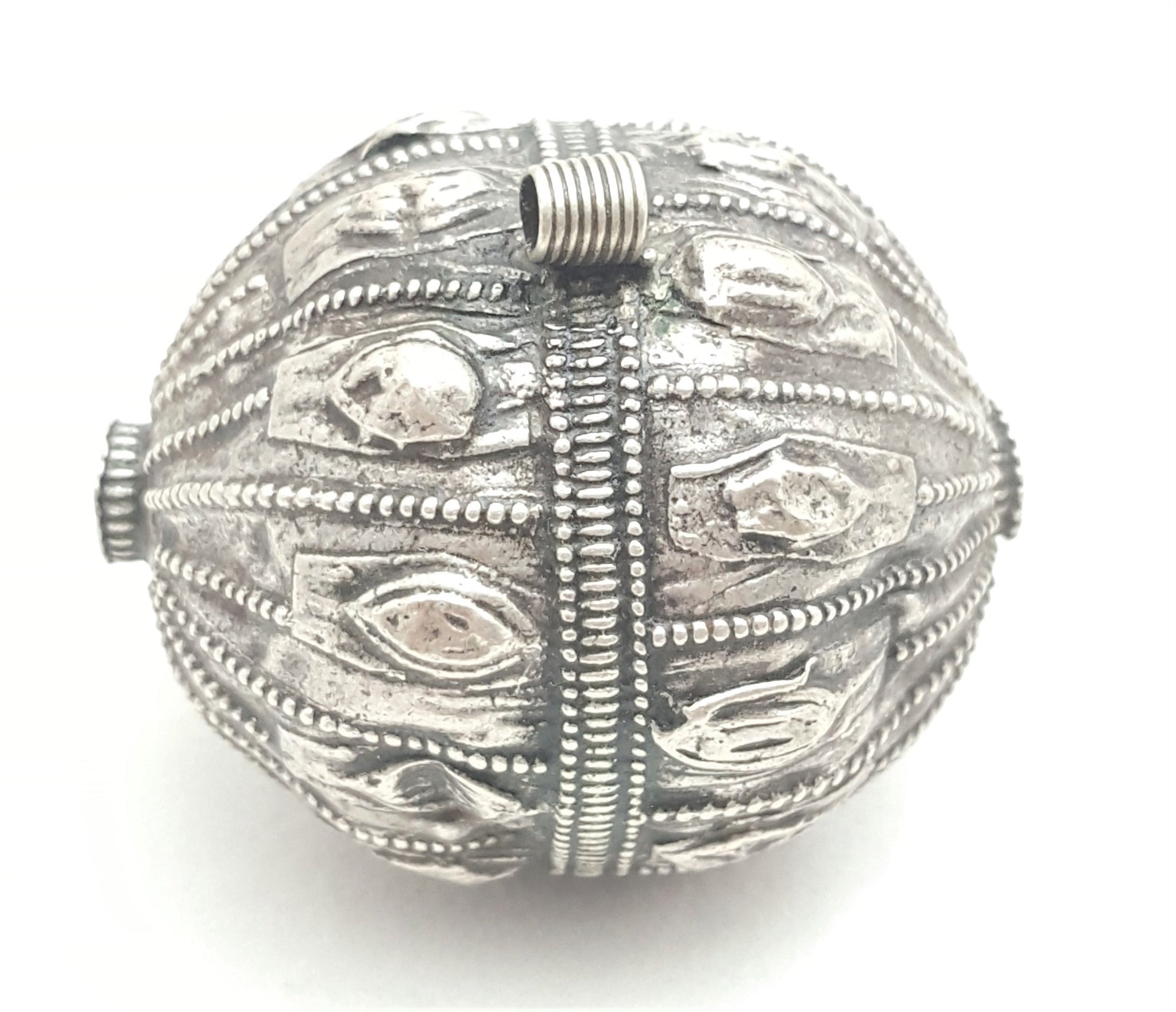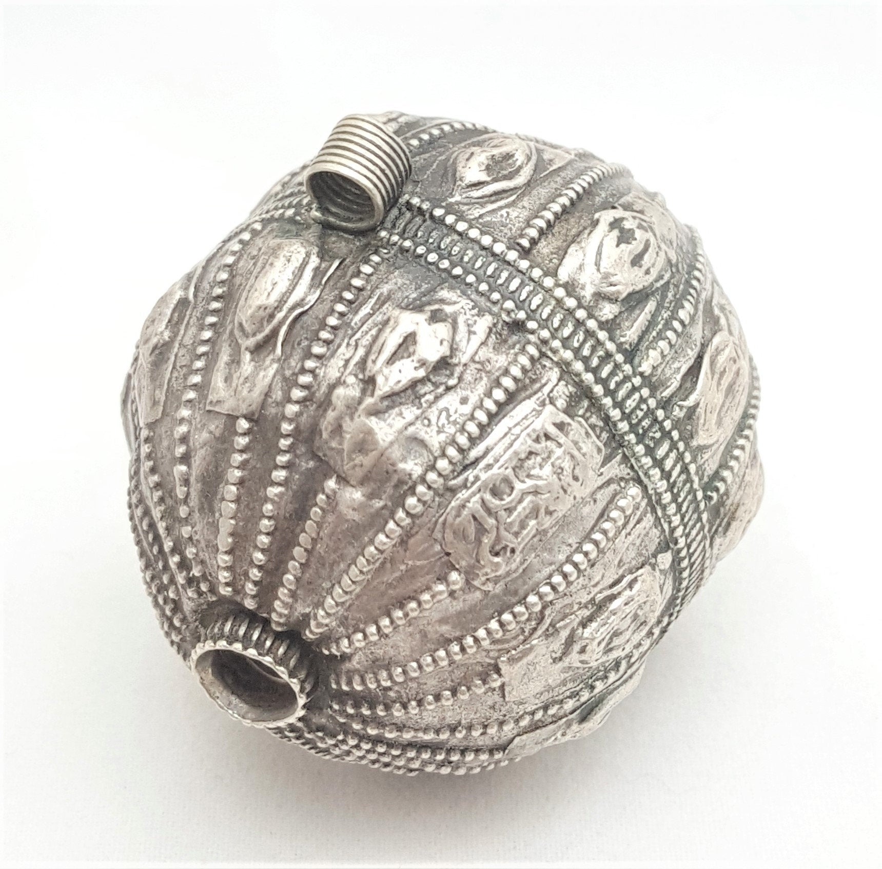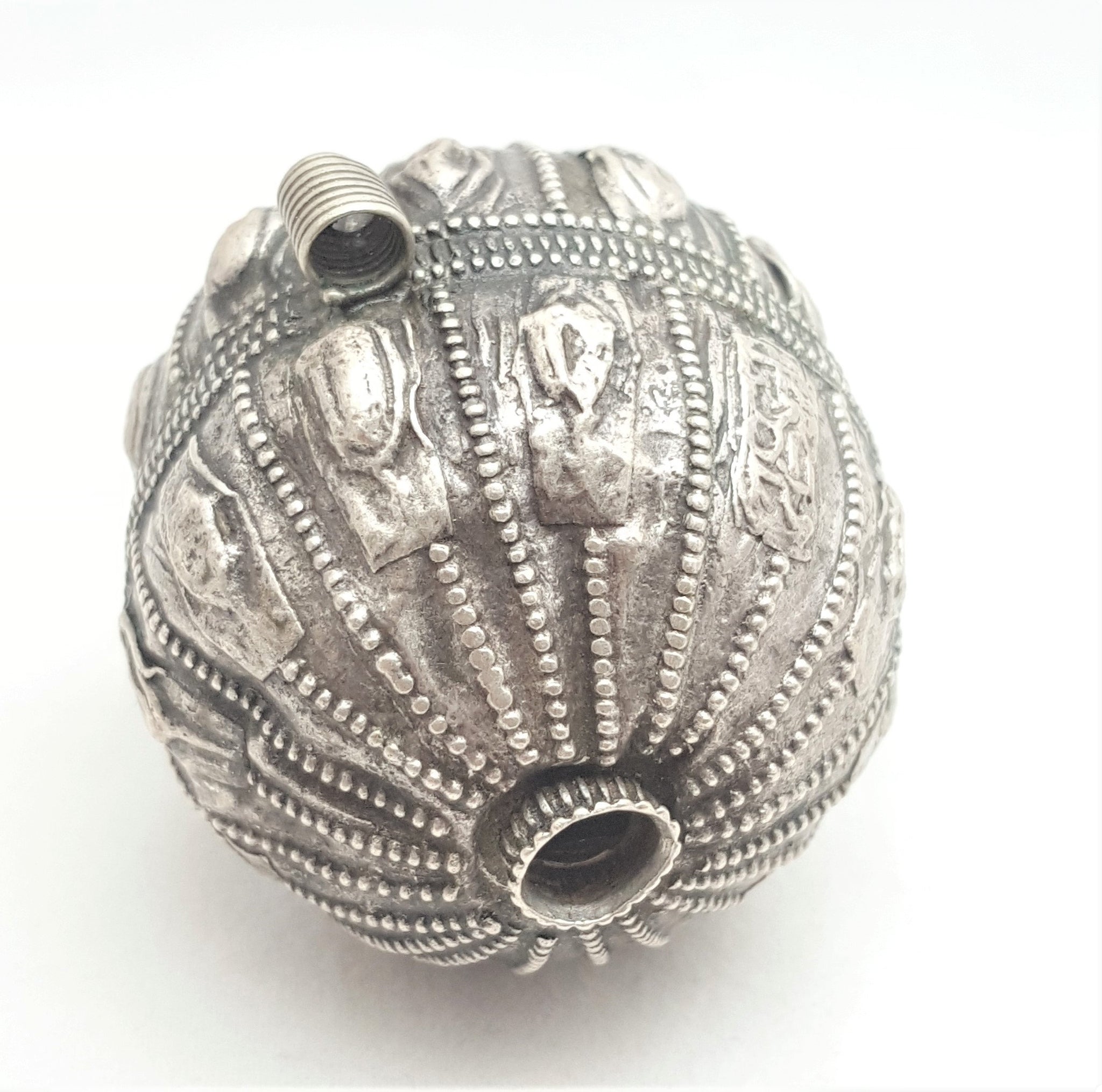 old silver hallmarked beads from Yemen, circa 1910s. Rare with intricate silver smiting Beautifully made, decorated and shaped. Good alloy of silver. Old pieces with beautiful patina,This kind of ones. Good condition Collectible and useful as jewelry supplies Measures: 2''x 1''.5 / w 14.GR