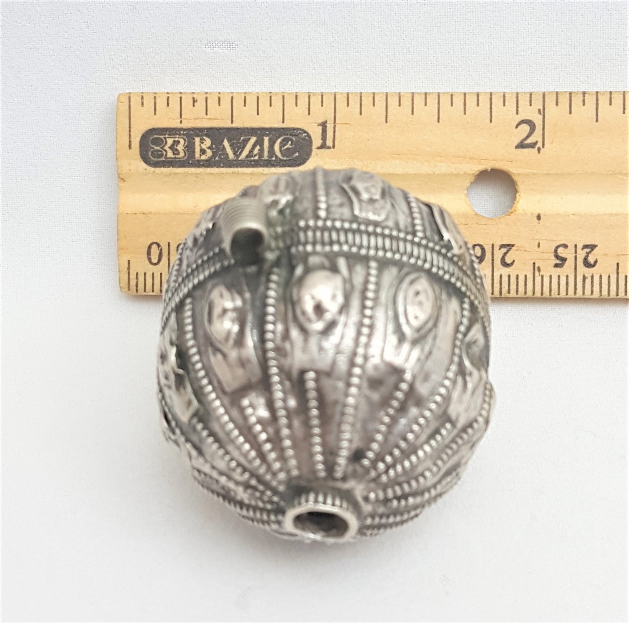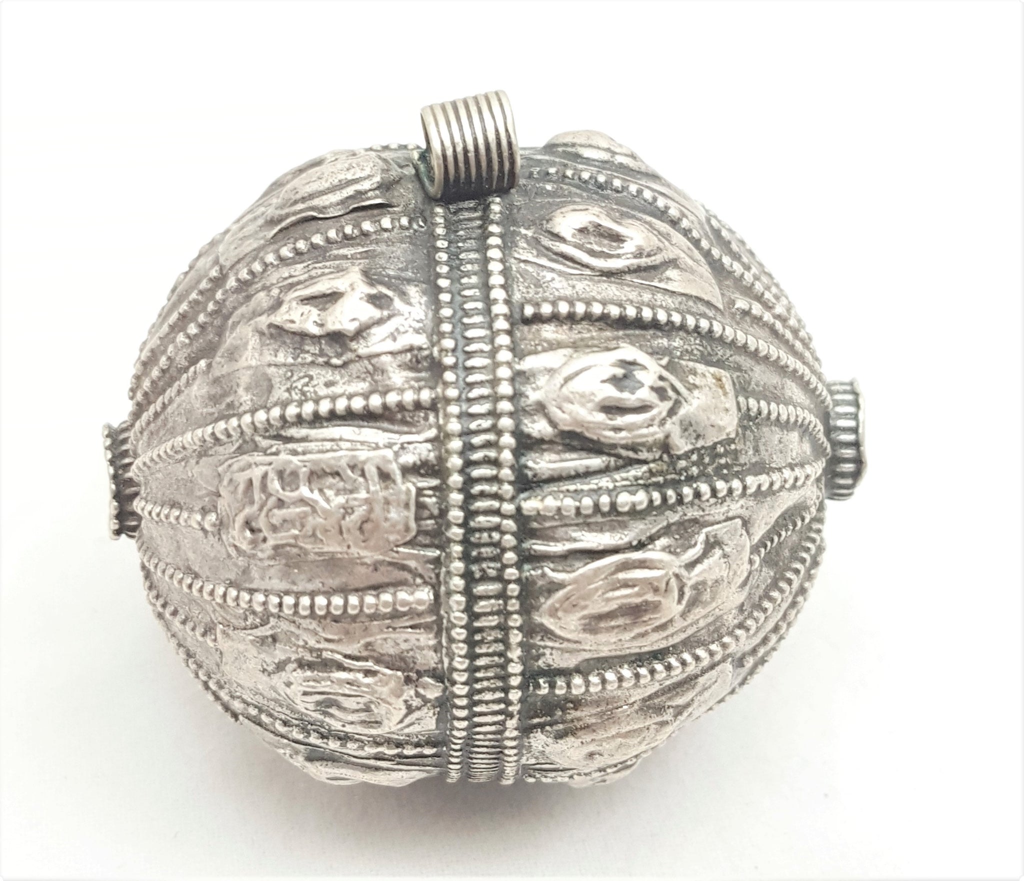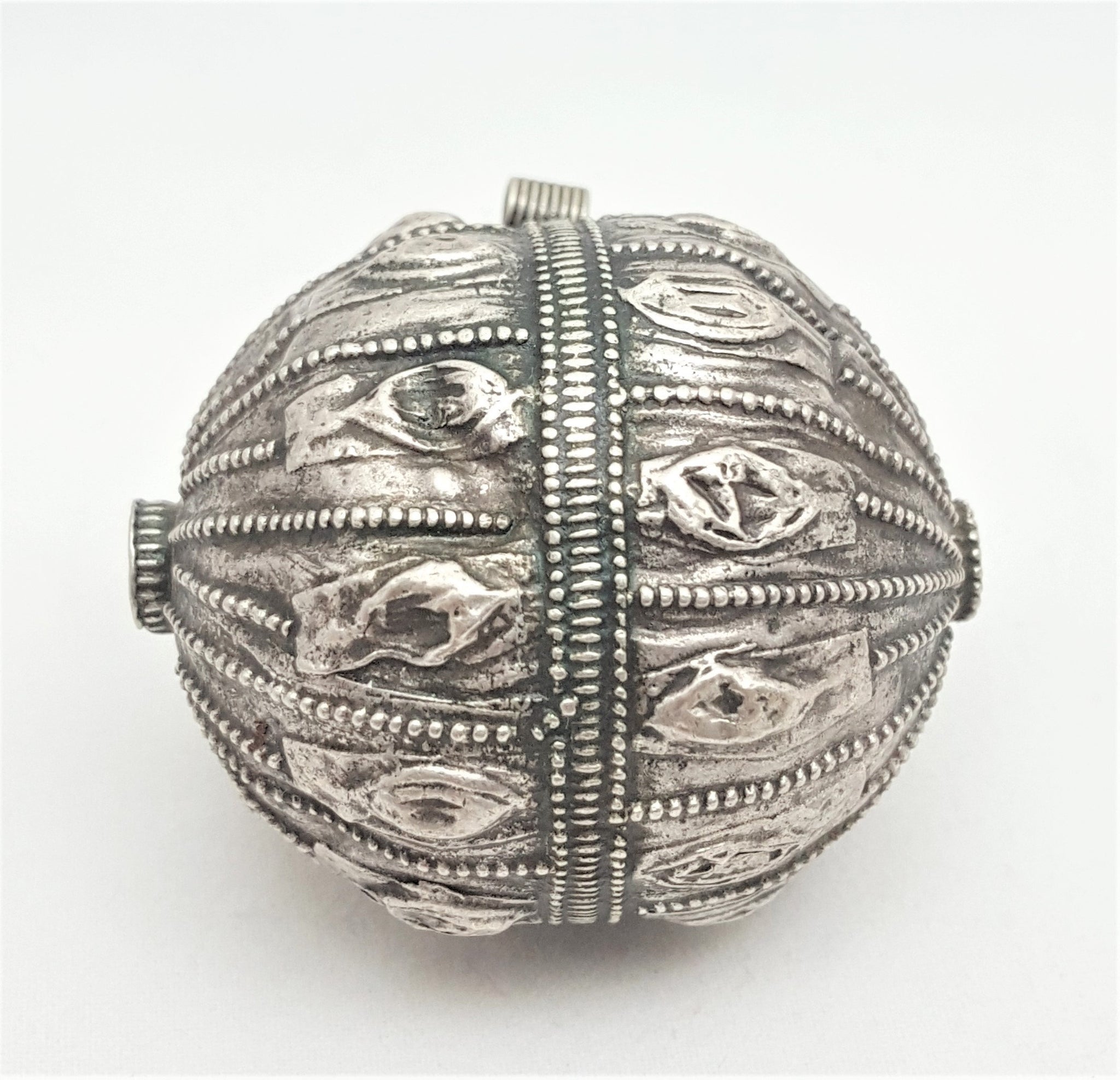 old silver hallmarked beads from Yemen, circa 1910s. Rare with intricate silver smiting Beautifully made, decorated and shaped. Good alloy of silver. Old pieces with beautiful patina,This kind of ones. Good condition Collectible and useful as jewelry supplies Measures: 2''x 1''.5 / w 14.GR