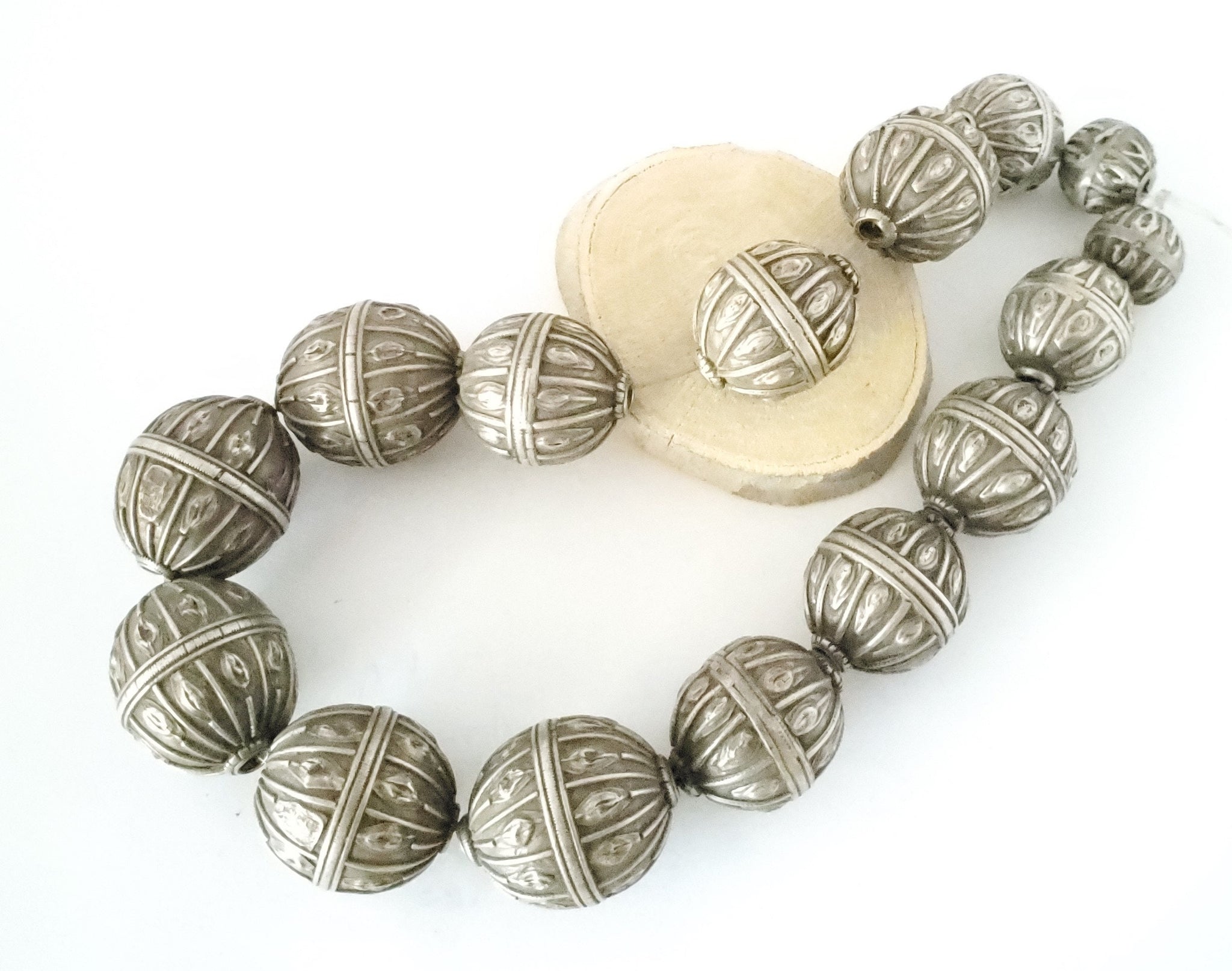 15 old silver Globe granulation hallmarked beads from Yemen Bedouin tribal circa 1930s. Rare with intricate silver smiting Beautifully made, decorated a. Good alloy of silver. Old pieces with beautiful patina ,This kind of ones. Good condition Collectible and useful as jewelry supplies